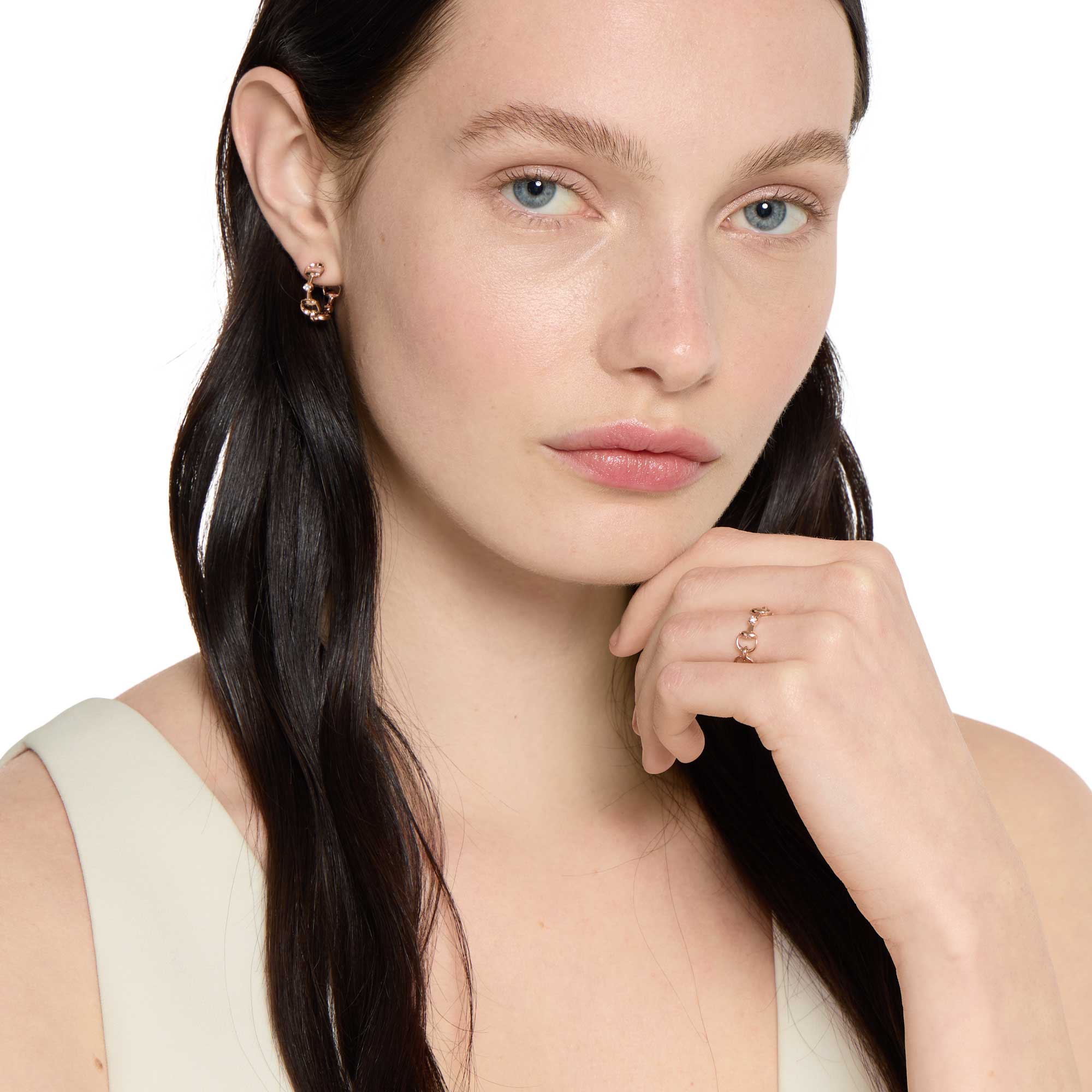 An extension of the Horsebit range includes eye-catching diamonds across a selection of rose gold jewelry pieces. This ring displays the equestrian-inspired motif as an interlinked variation of the well-know design.
