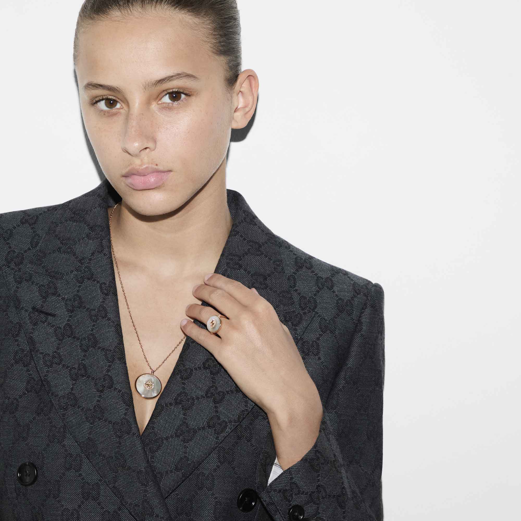The Interlocking G logo appears in elegant new interpretations for Pre-Fall 2024. Precious black onyx stone is paired with yellow 18k gold and embellished with sparkling diamonds. This ring can be matched with other accessories from the same line.