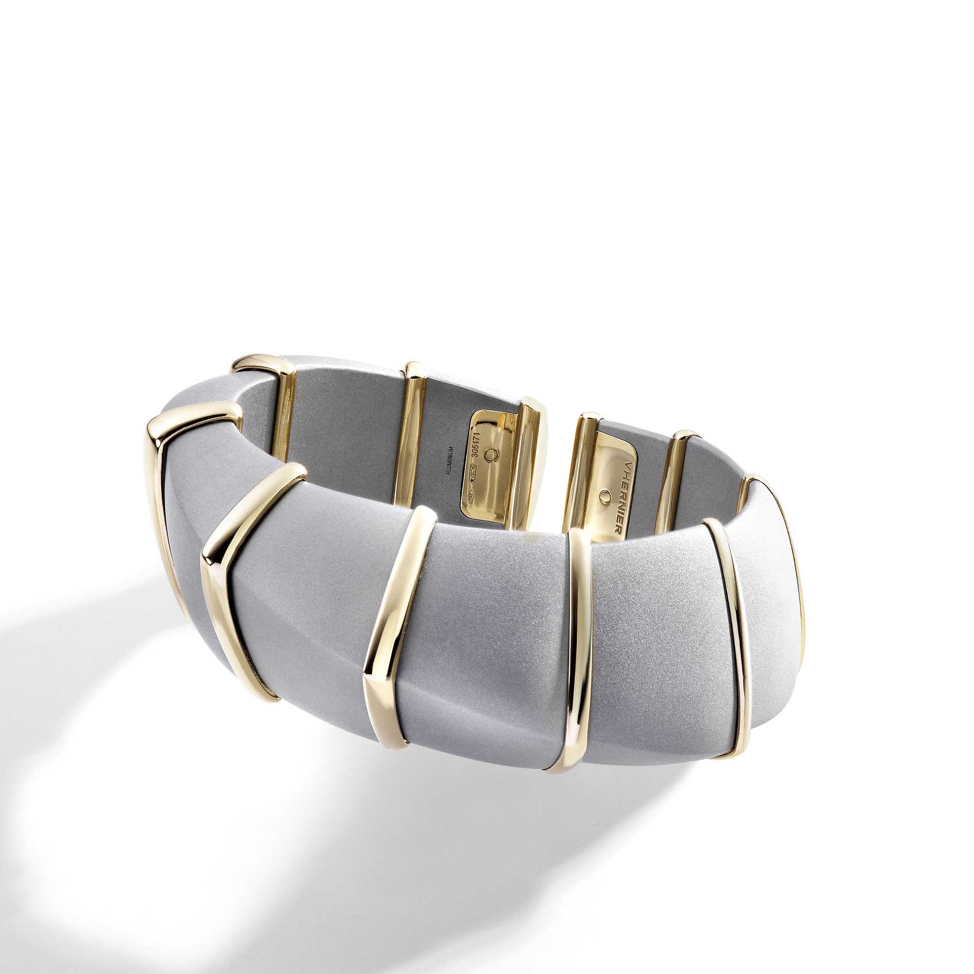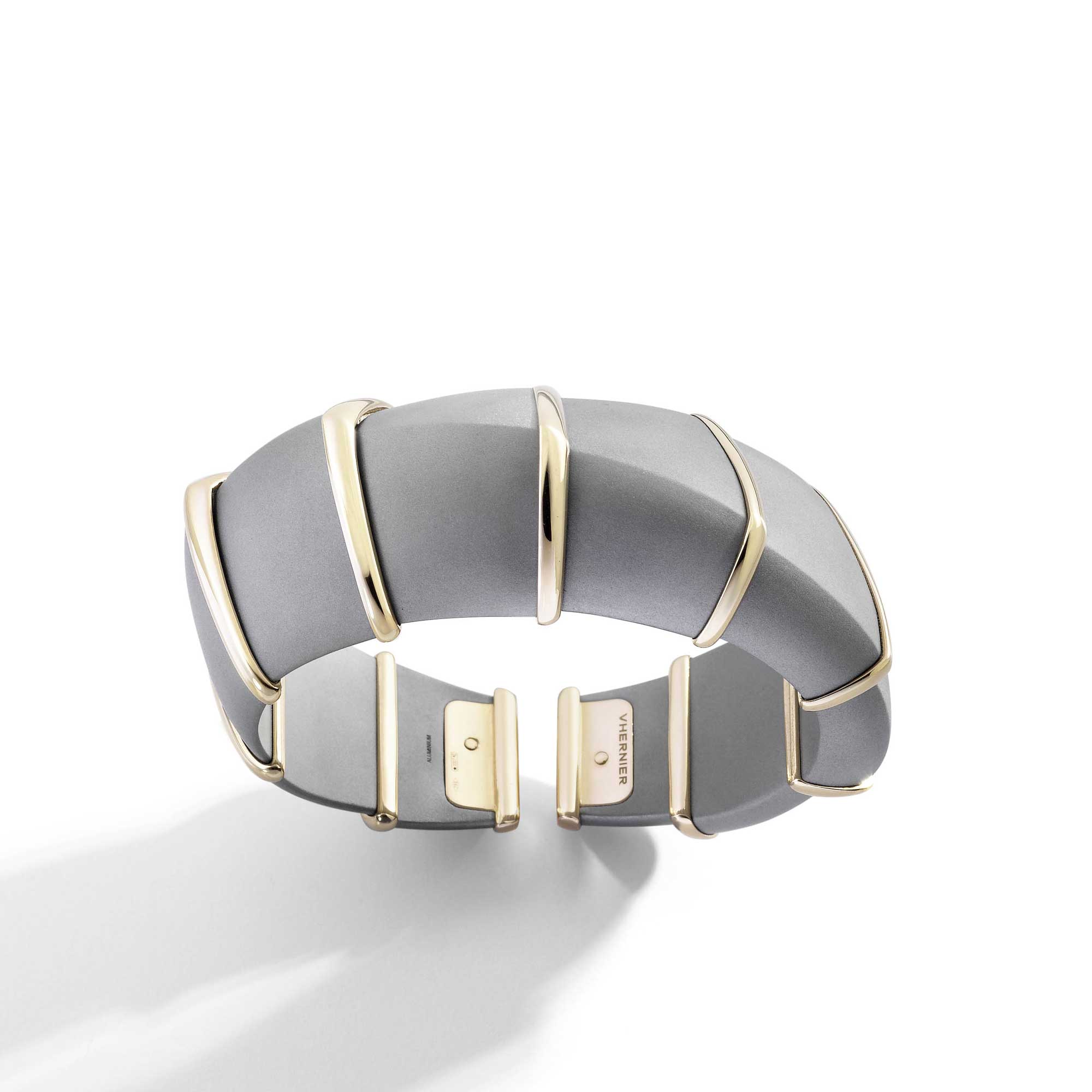 Pure lines and bold shapes combine to sculpt the new Ardis collection. Visually captivating and tactilely inviting, the bracelet and the ring in aluminum, gold and diamonds are a true embodiment of the Vhernier ethos.
