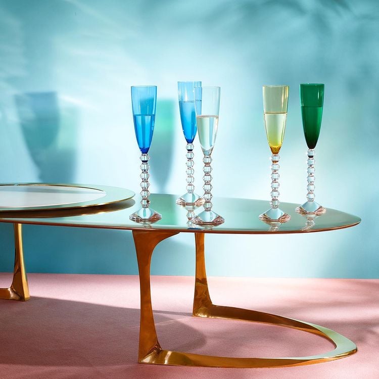 The angularity of the lower half is artfully juxtaposed with the smoothness of the columnar bowl. Designed for Baccarat by Savinel & Rozé, the unique sculpted zigzag of the stem makes sipping bubbly all the more special. The Vega Flutissimo is available in a variety of colors, and the more extensive Vega set also includes a champagne flute, martini glass, and a small glass, in addition to other bar and tableware.
