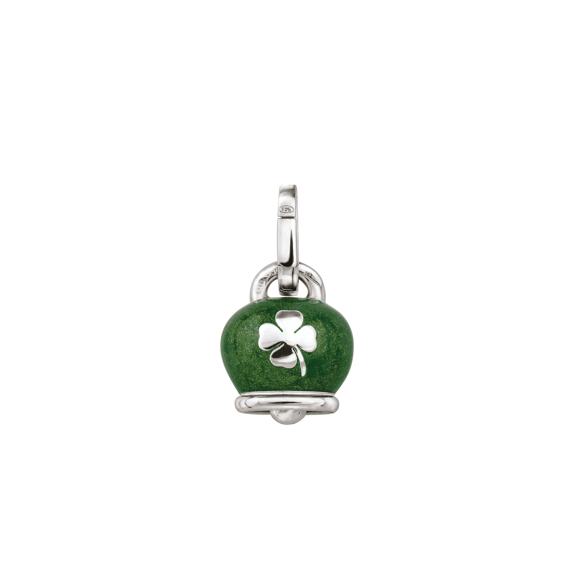 Medium campanella charm with four-leaf clover in 925 silver and green enamel luminescent