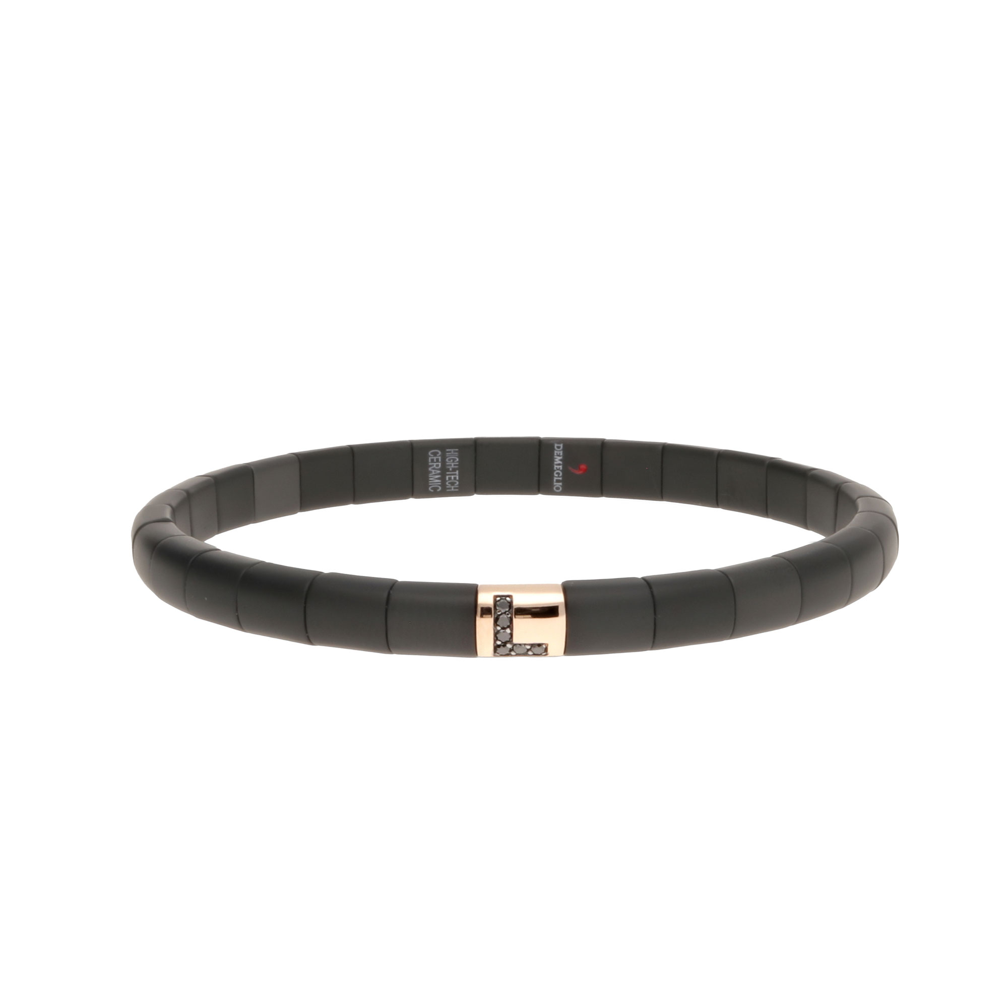 SKU: PU4NLDNORSWomen’s elastic bracelet made of matte black high-tech ceramic, featuring an “L”-shaped element in 18-karat rose gold set with black diamonds.