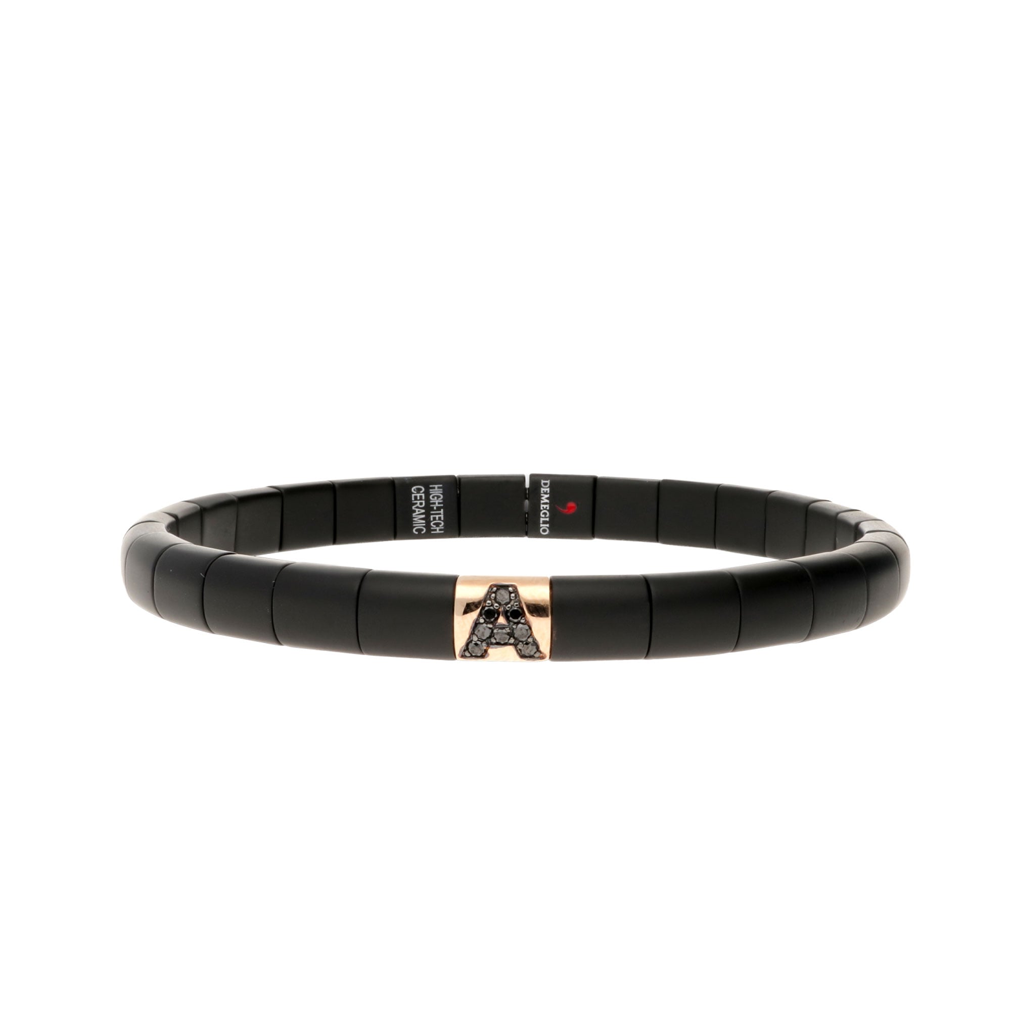 SKU: PU4NADNORSWomen’s stretch bracelet in matte black high-tech ceramic, featuring an “A” motif in 18-karat yellow gold and black diamonds.