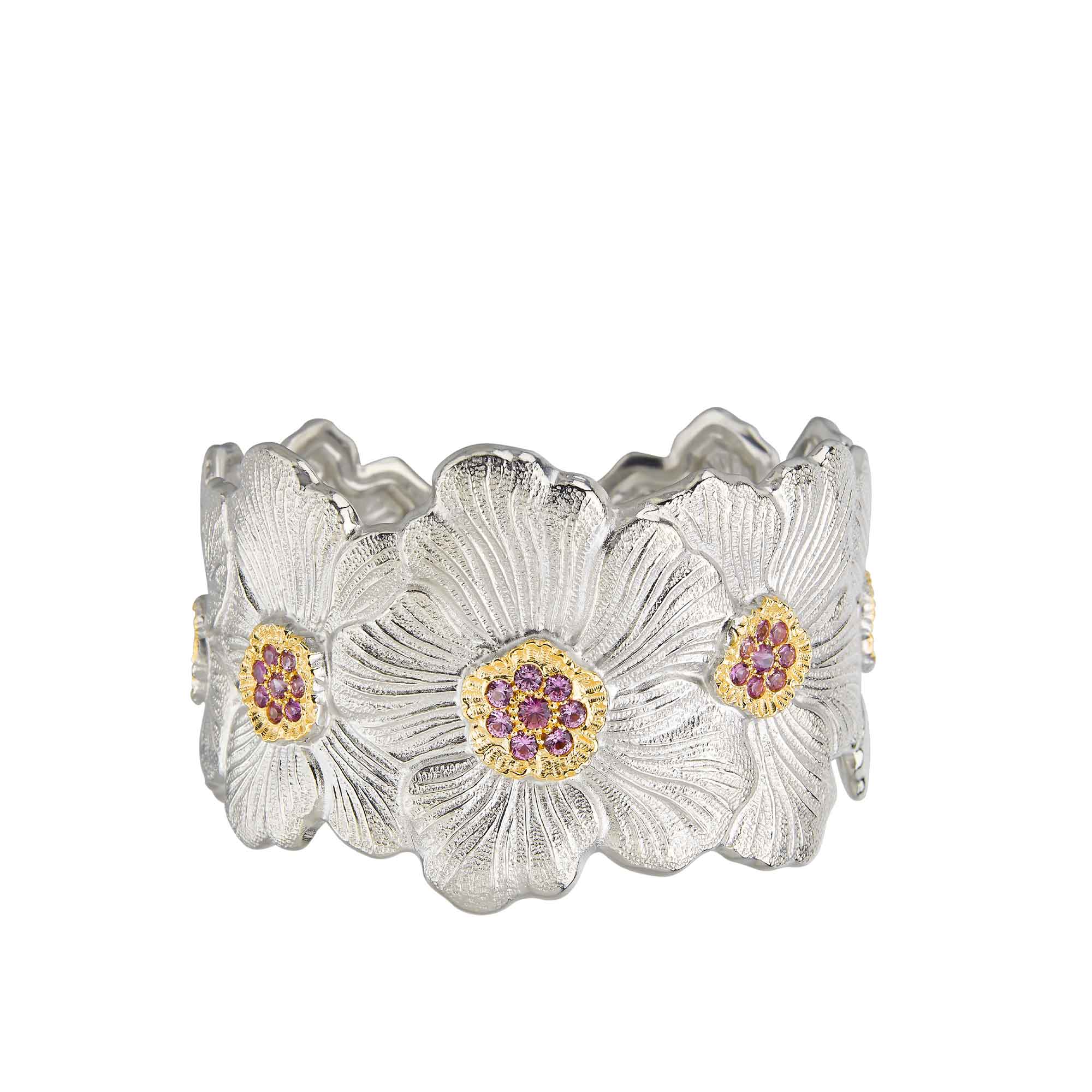 The Blossoms collection interprets Buccellati’s unique style with a youthful twist, developed using a noble metal—silver—enhanced by skilled engraving, golden accents, diamonds, and colored stones. The passionate dedication to design, craftsmanship, and quality workmanship are synonymous with creations of the highest level.