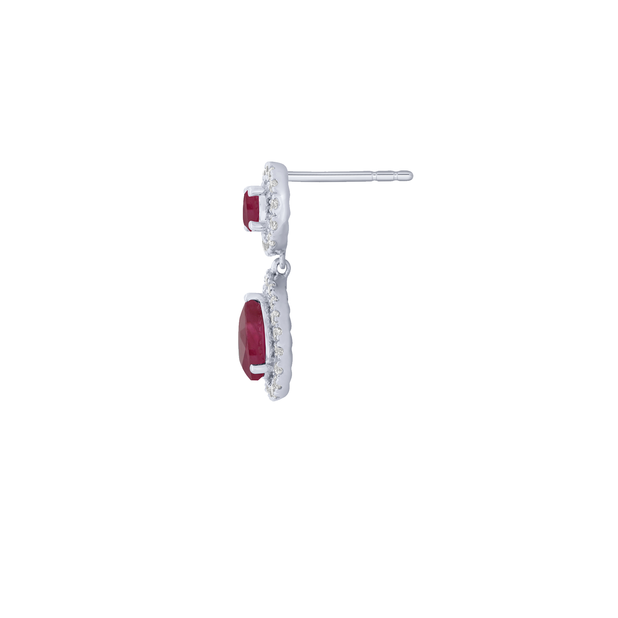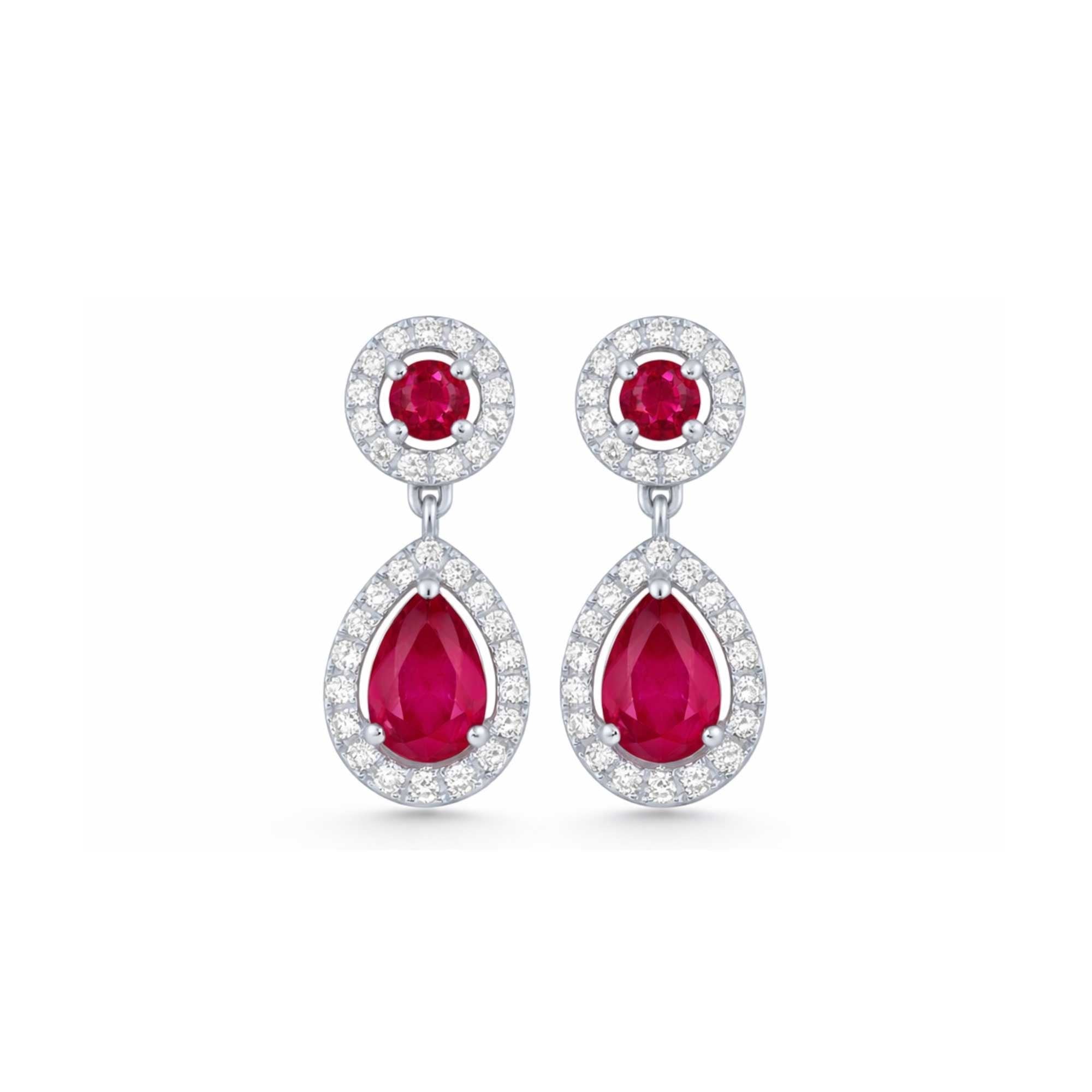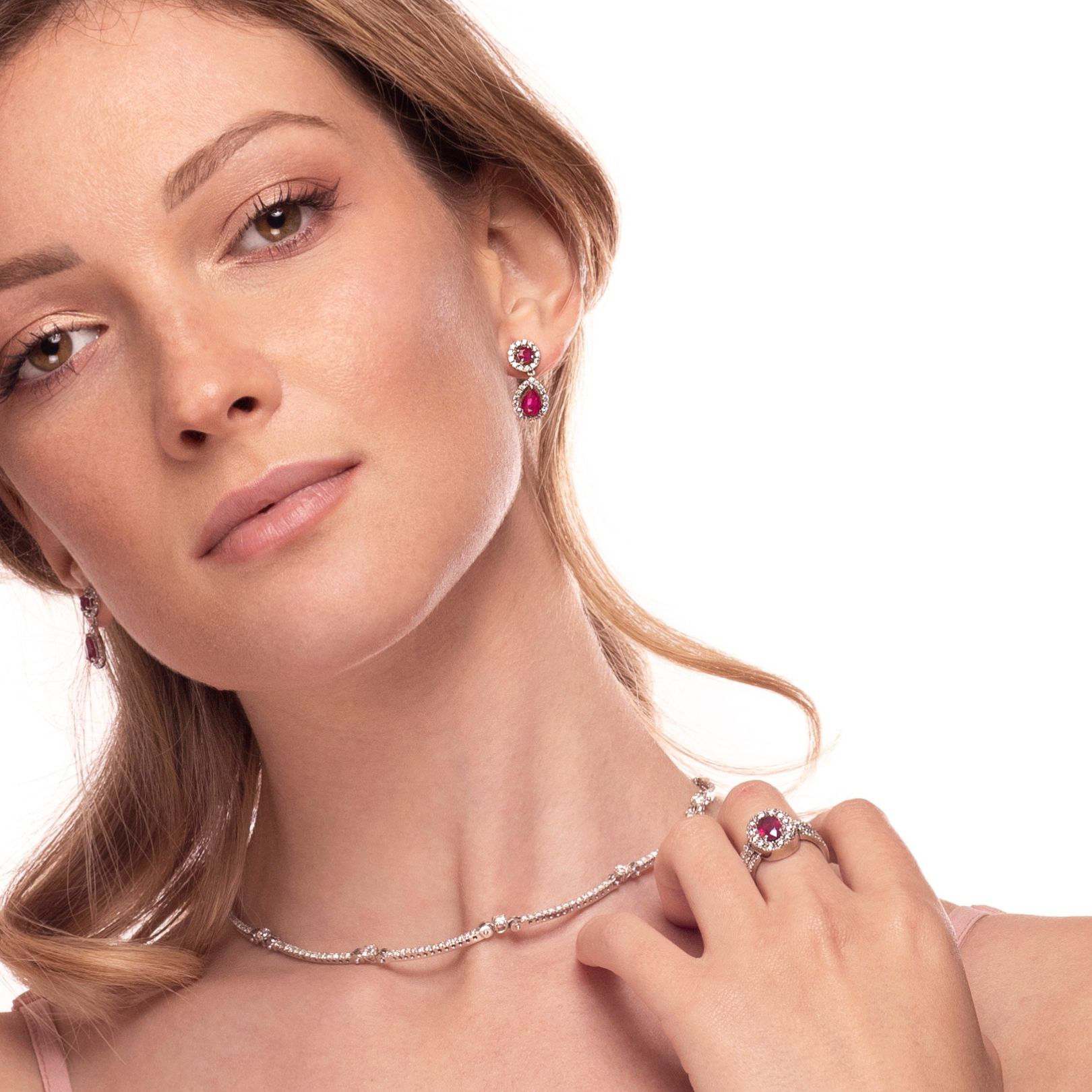 We create collections of classic, manufactured jewels, defined by a very high quality of the worked stones. From here Trilogy earrings in brilliant rubies color