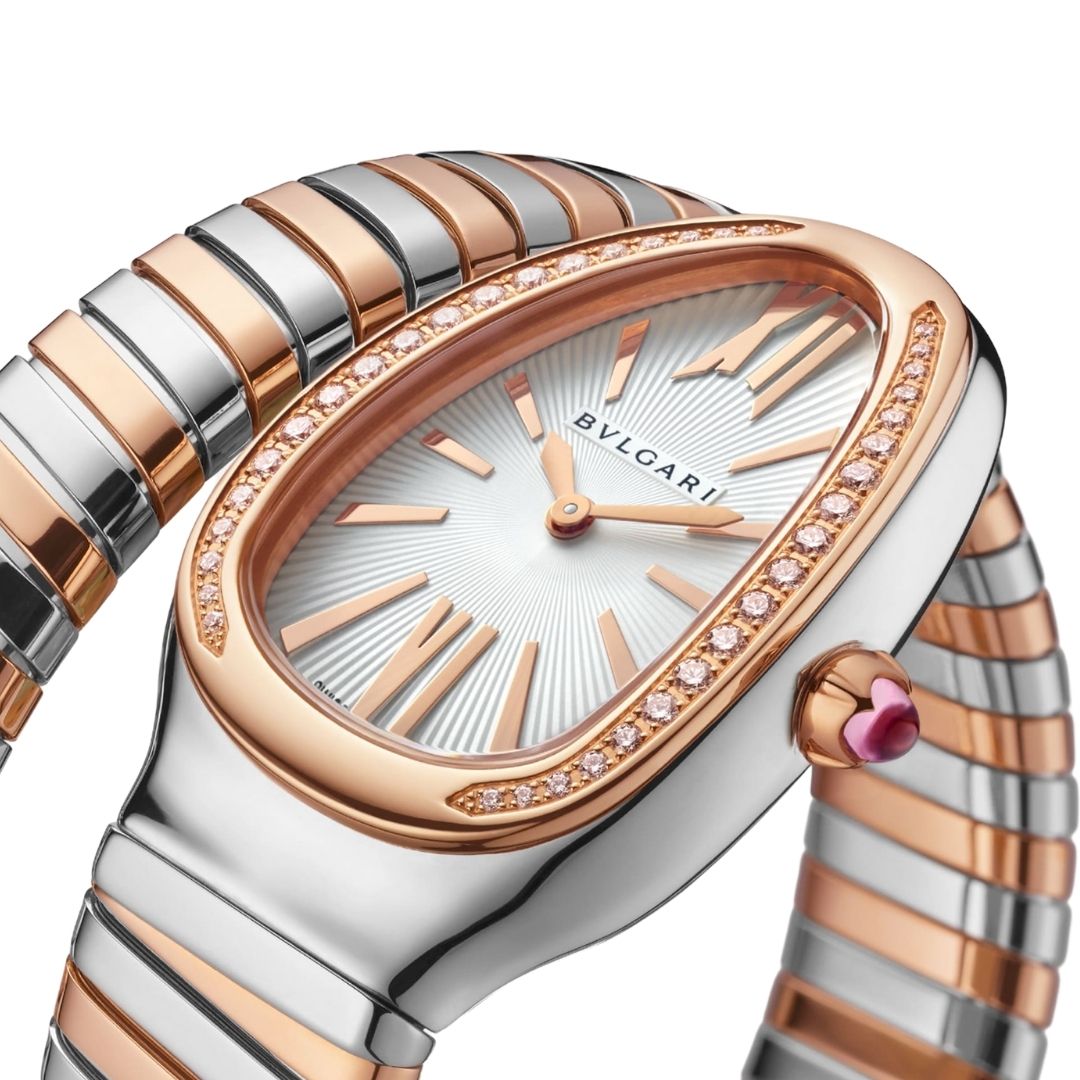 Combining two of Bulgari’s most iconic design symbols, the Serpenti Tubogas watch combines the sinuousness of the snake with the contemporary allure of Tubogas. A perfect harmony of tubular shapes that evoke the sensuality of feminine curves and the supple elegance of the snake. With its unique and captivating style, the watch renews the iconic appeal of an ever-evolving collection. Serpenti Tubogas watch with quartz movement, 35 mm curved stainless steel case, 18 kt pink gold bezel set with brilliant-cut diamonds, 18 kt pink gold crown set with cabochon-cut pink rubellite, opaline silver dial with guilloché soleil finishing and hand-applied indexes, 18 kt pink gold and stainless steel spiral bracelet.