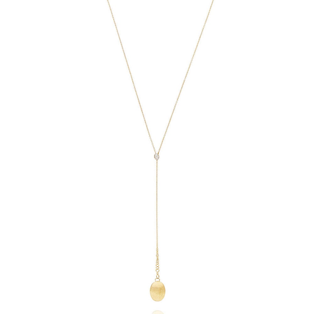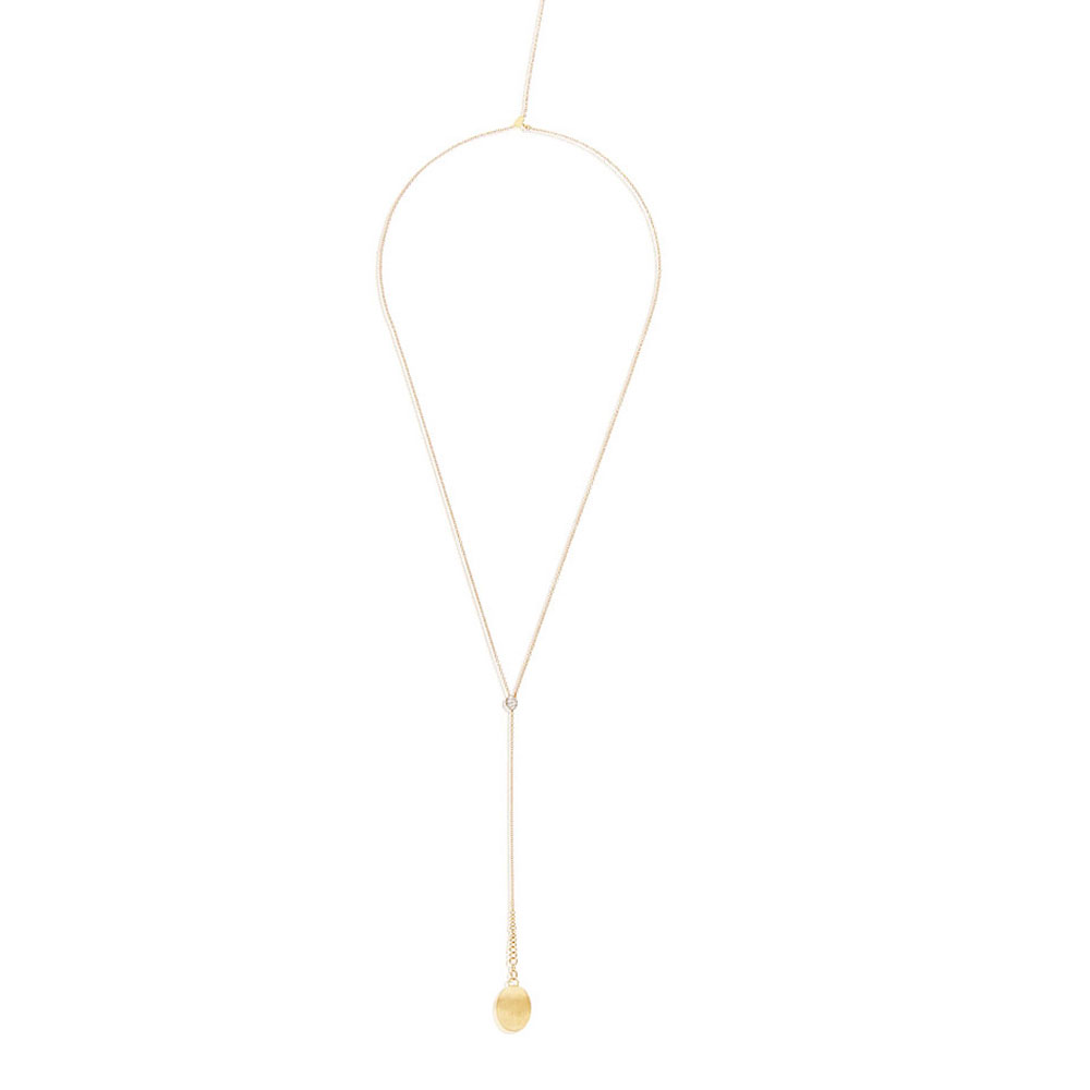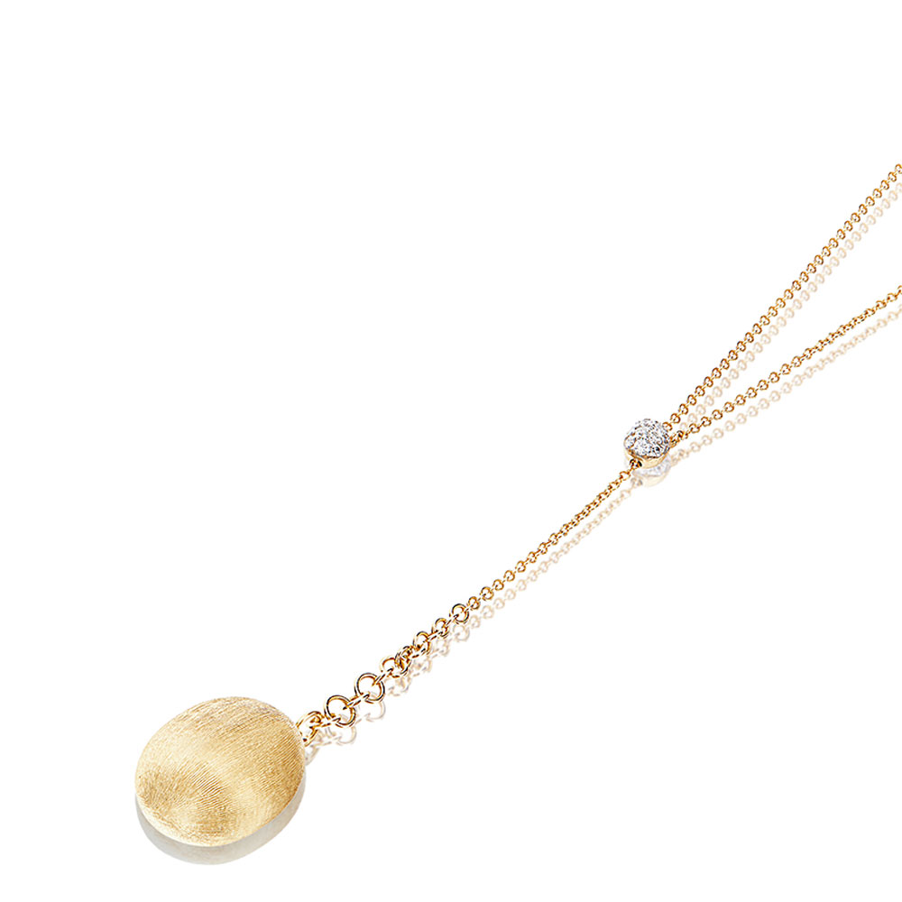 A delicate hand-engraved 18kt gold boule crowned with diamond drops give life to a simple and sophisticated pendant at the same time, and that above all hides an extreme level of versatility. A small gold ring positioned on the back and a special hole inside the diamond boule allows you to adjust the necklace in many different ways, opening this jewel to countless possibilities of interpretation.