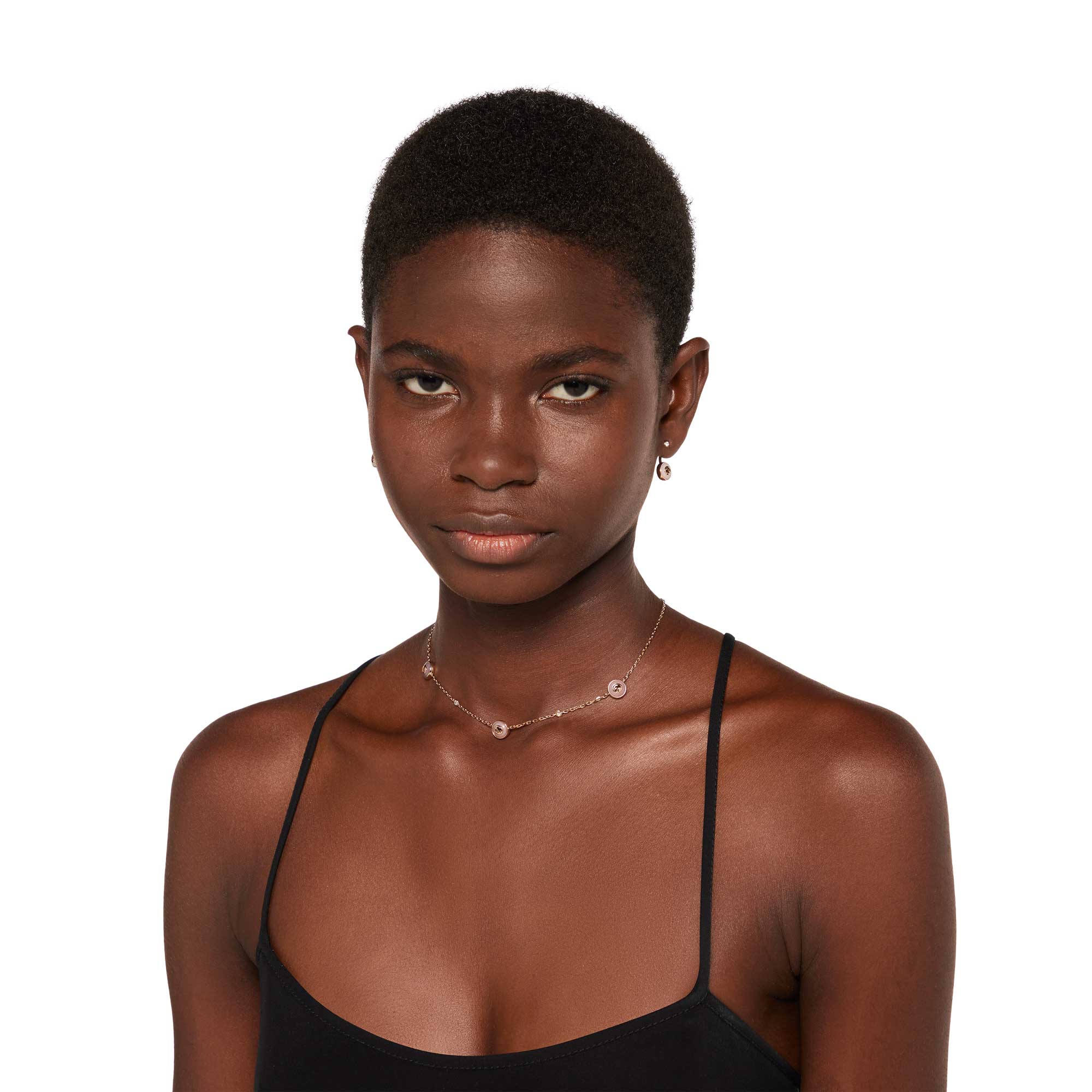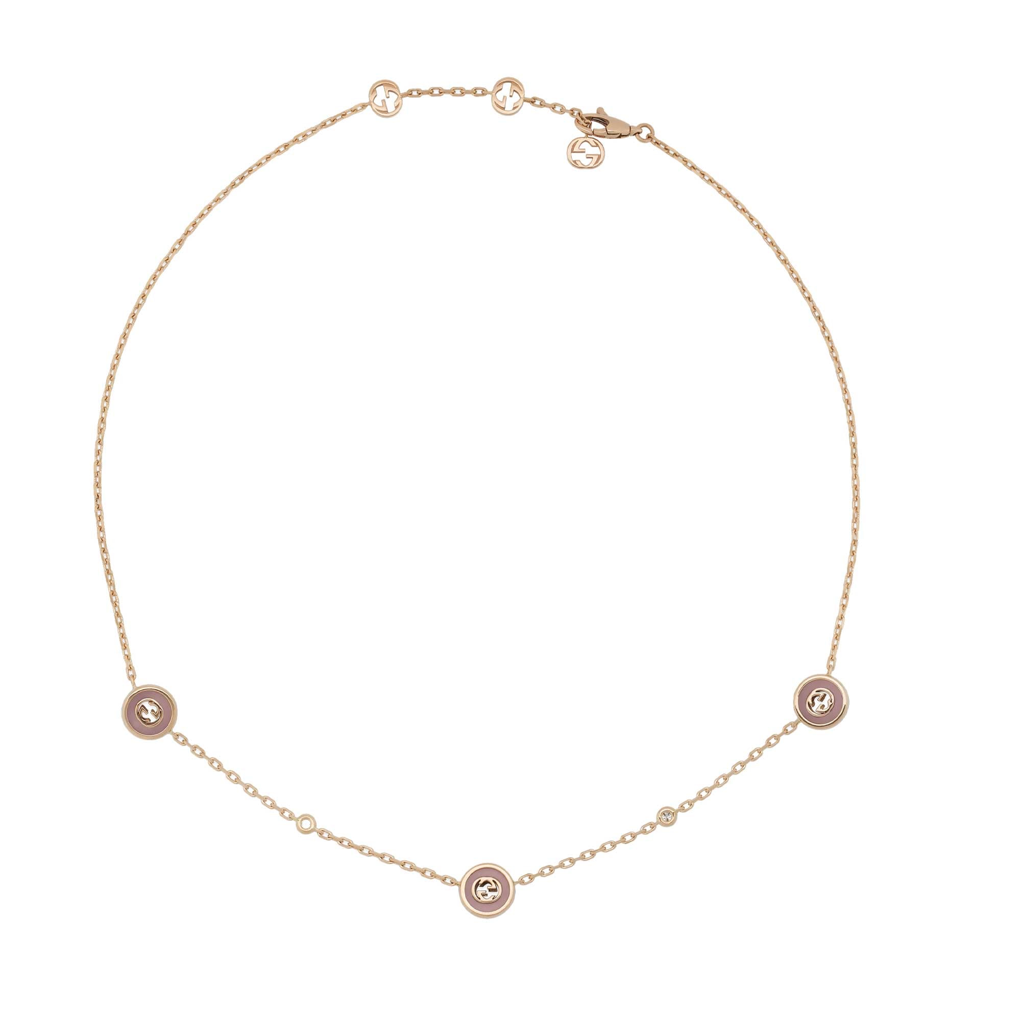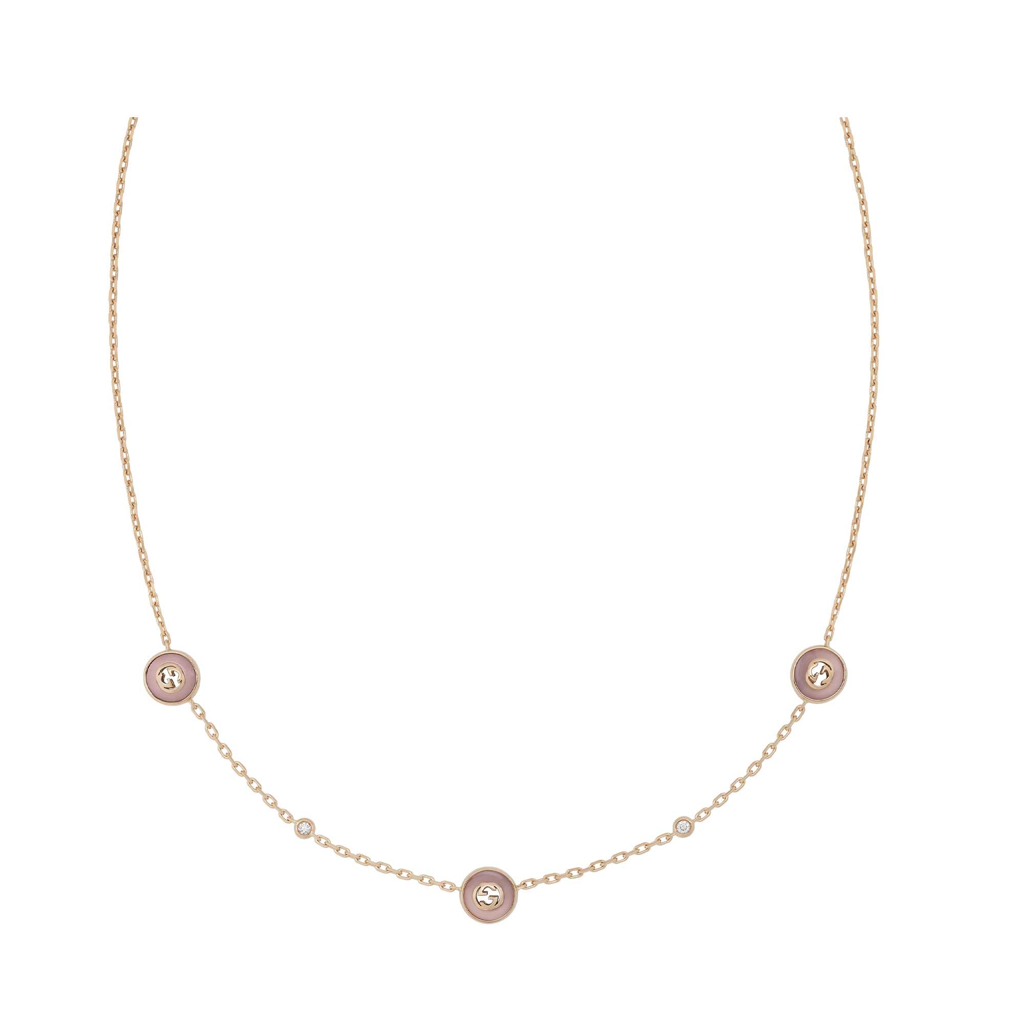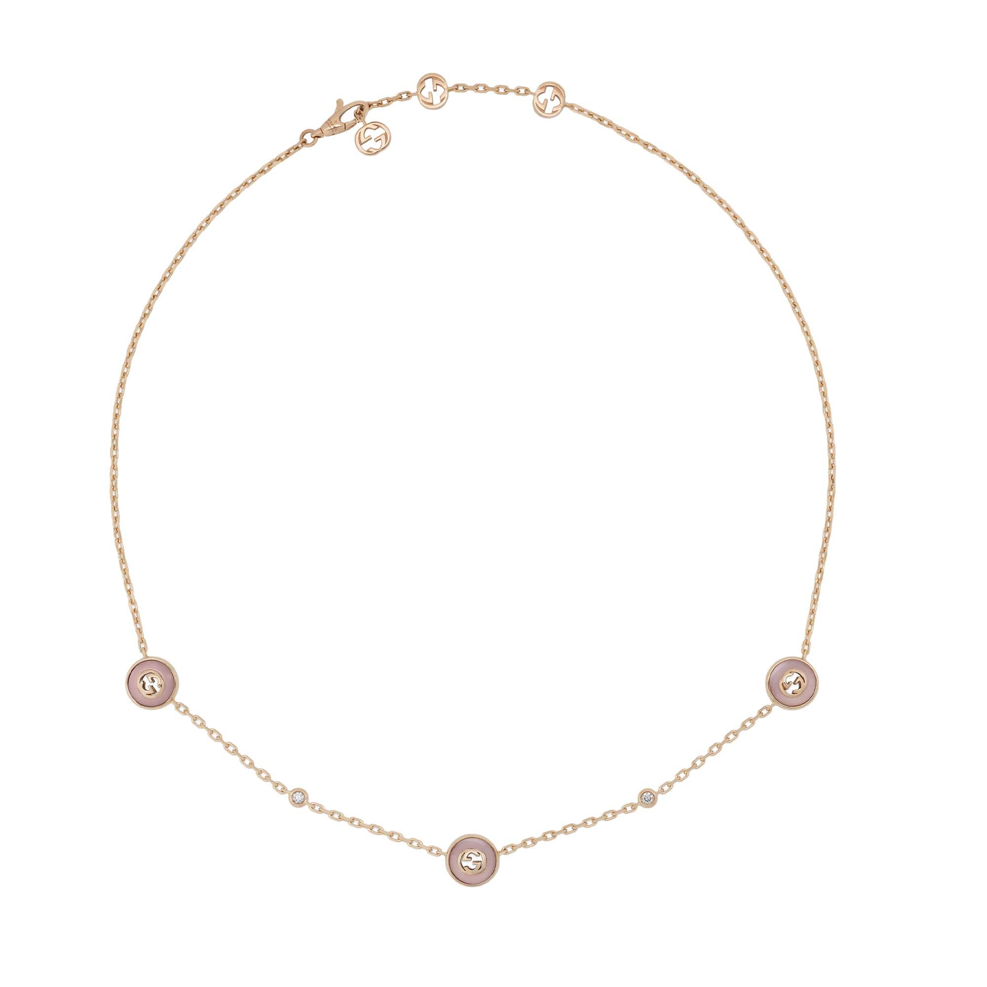 The latest Gucci Interlocking line features the pink opal, a precious stone known for its calming qualities. New styles in rose gold showcase the gemstone alongside white diamonds, such as this chain necklace. Three stones appear alongside the Interlocking G, interspersed with two sparkling diamonds.