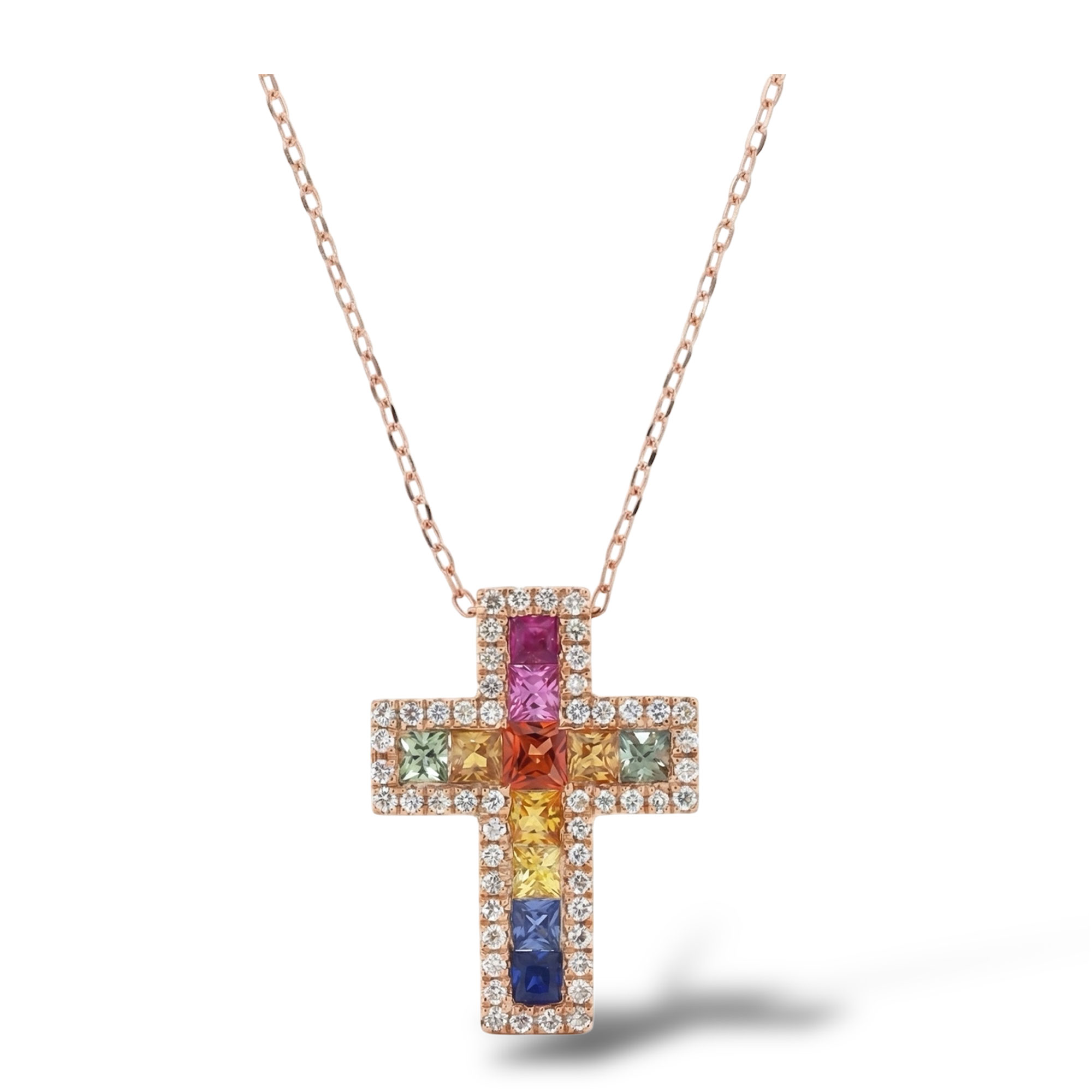 SKU: CN331502-RZRose gold necklace with diamond cross and multi-coloured sapphires.