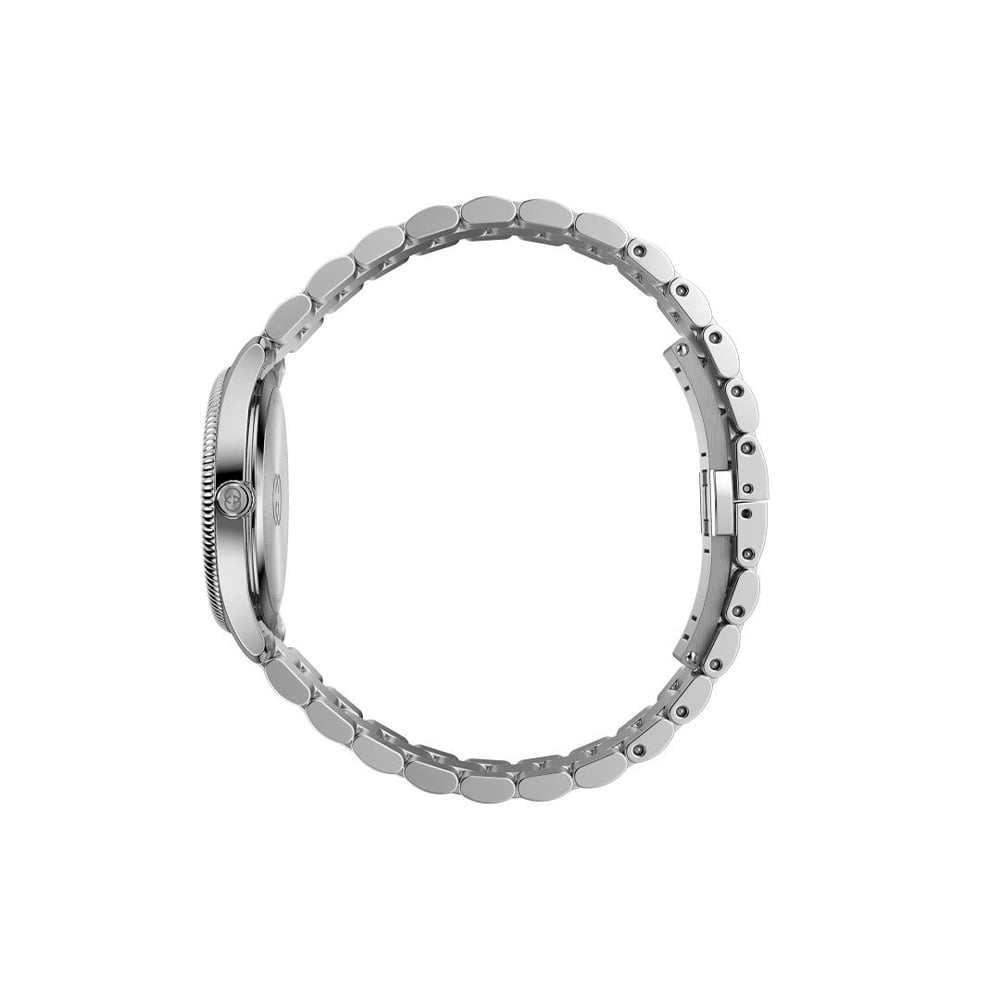 The season’s polished look extends to watches and jewellery, including the G-Timeless collection. The round watch spotlights a sleek dial finish with subtle expressions of the Interlocking G and the Gucci lettering. Finished with a steel bracelet, the accessory is enriched with signature motifs of the House.