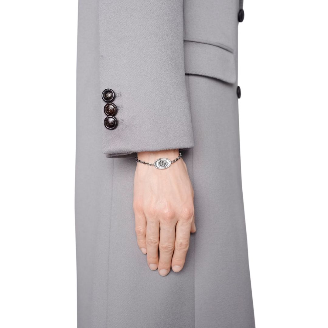 The Double G logo is reproduced in a precious torchon effect on this fine 925 sterling silver bracelet. With elaborate designs enriched by accents reflecting the House’s tradition, Gucci’s silver jewellery collection combines classic and contemporary references.