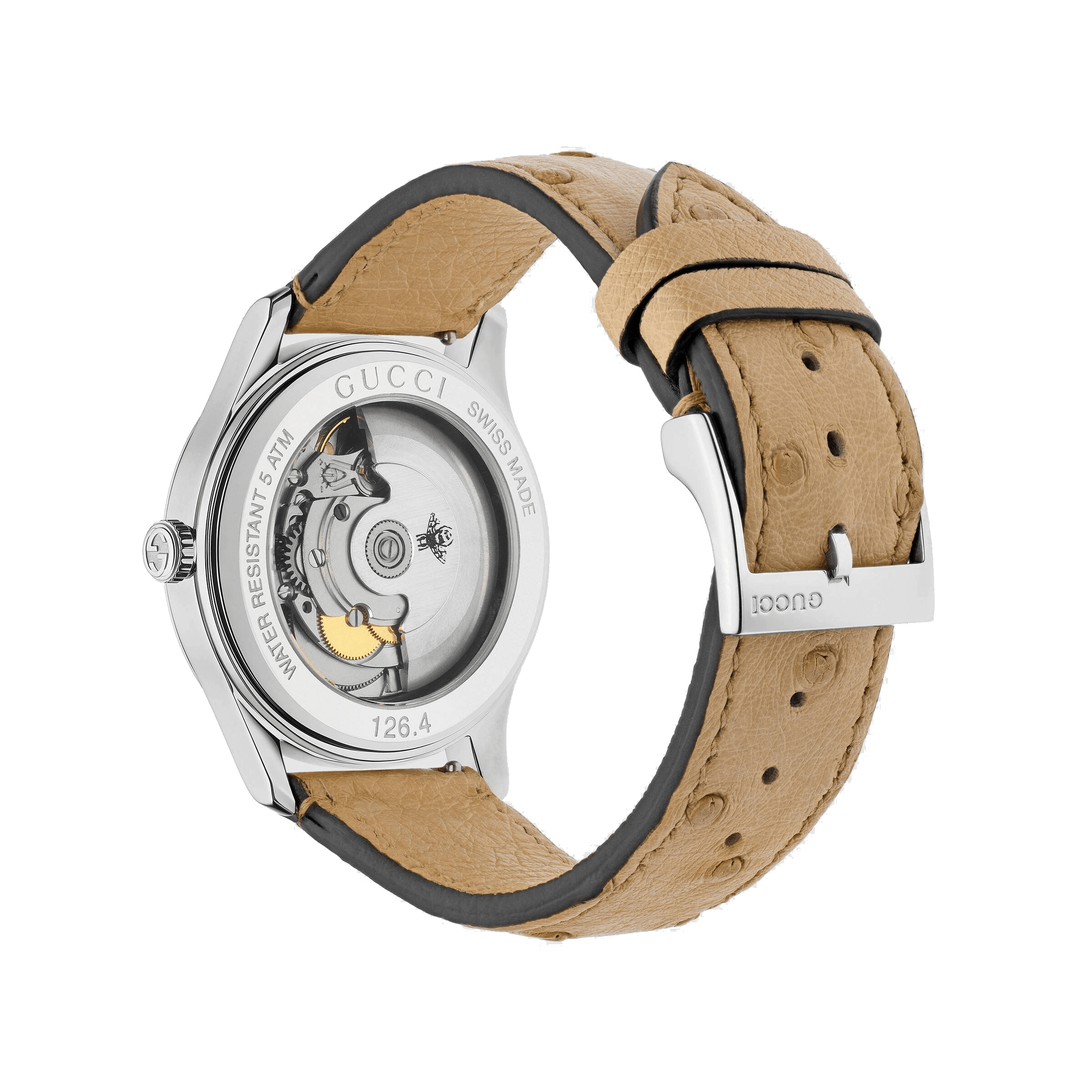 Part of the G-Timeless collection, this automatic watch has a transparent mother-of-pearl dial, allowing a view of the watch movement, enhanced by a silvered feline head. An interchangeable ostrich leather strap completes the style.