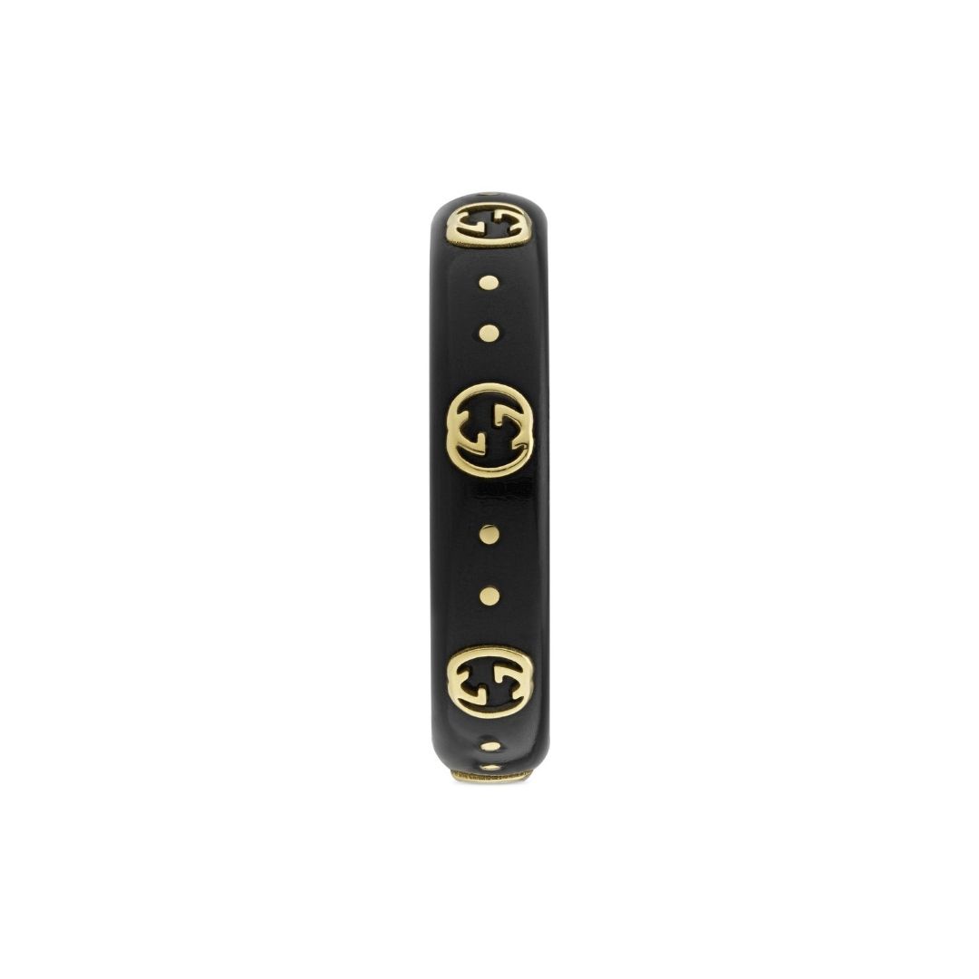 The Icon collection features some of the House’s most emblematic symbols. Representing the initials of the founder Guccio Gucci, the GG logo is presented in yellow gold contrasting with a black band in synthetic corundum.