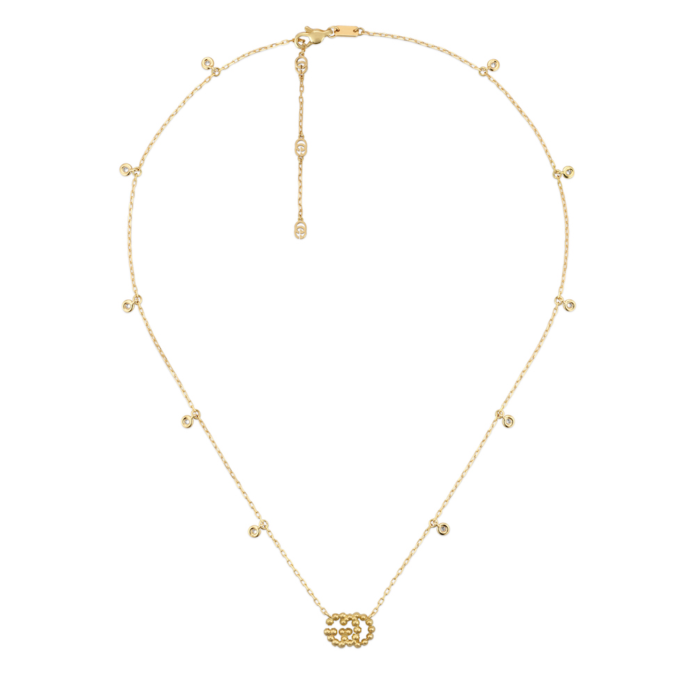 Inspired by a motif from the archives of the Seventies, one of the most characteristic periods in the House’s history, this slender necklace in 18kt yellow gold reintroduces one of the distinctive codes of the Gucci universe, the Double G, here embellished with round brilliant diamonds.