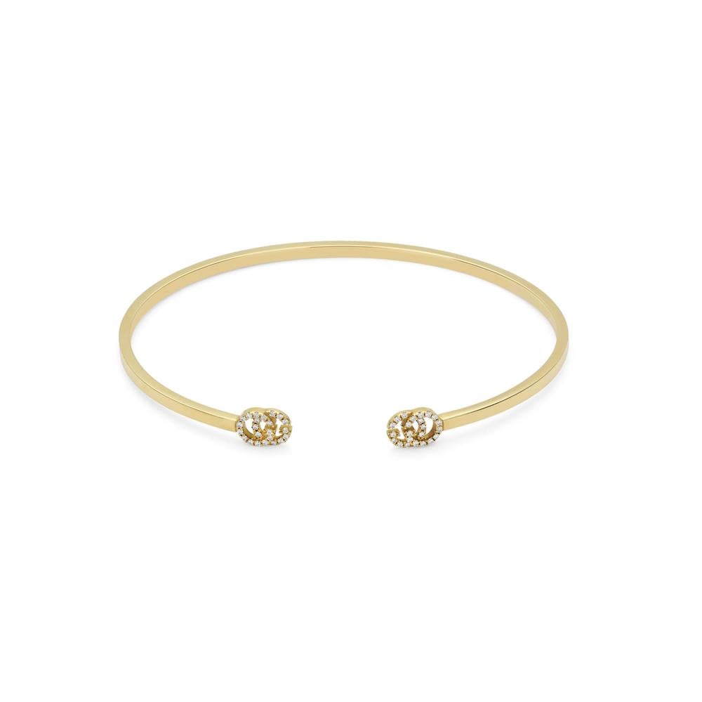 Inspired by a motif resurfaced from the archives of the 1970s, one of the most characteristic periods in the history of the Maison, the Double G, here embellished with round brilliant-cut diamonds, adorns the ends of this rigid bracelet in 18K yellow gold, designed to be worn with the other jewels in the collection.
