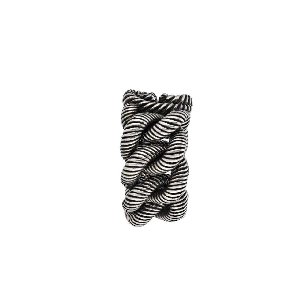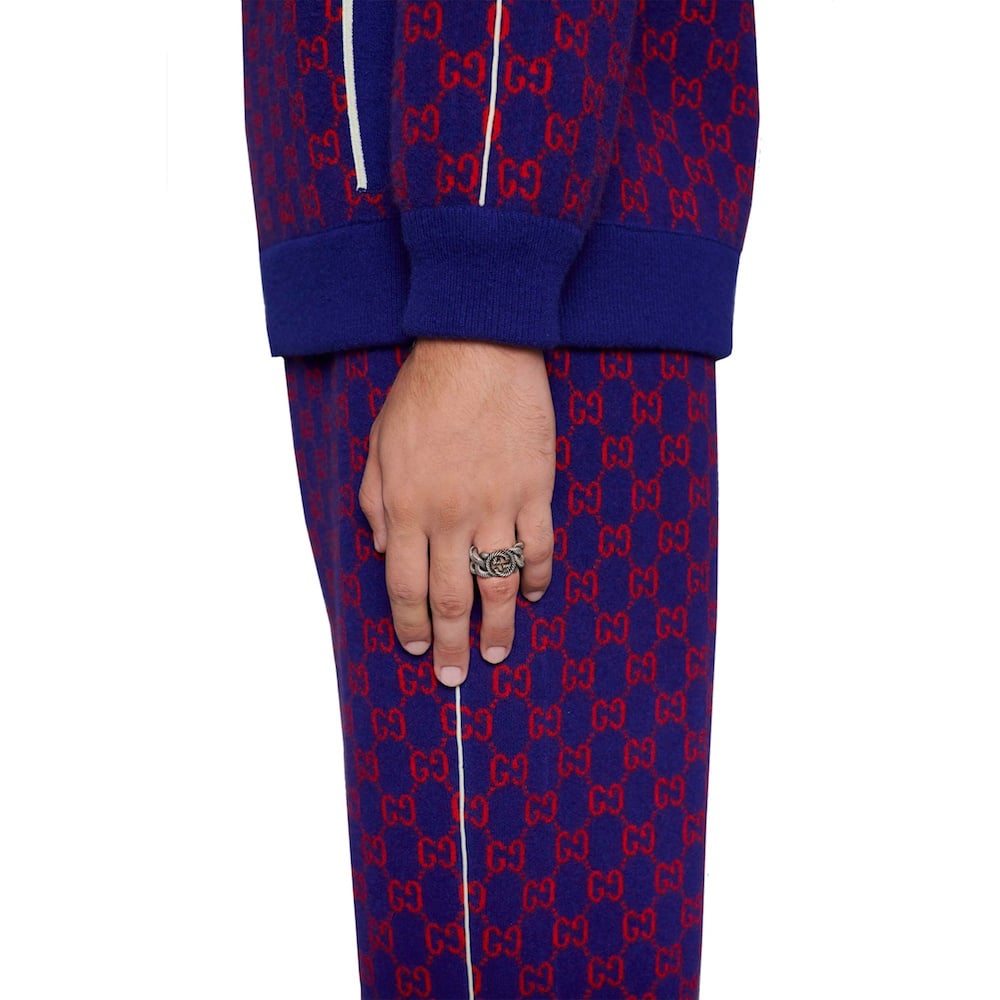 A silver ring characterised by a dark, aged finish and further enriched by the Interlocking G logo. The textured band speaks to the House’s equestrian heritage, recalling a specific chain style originally used as part of horse tack.