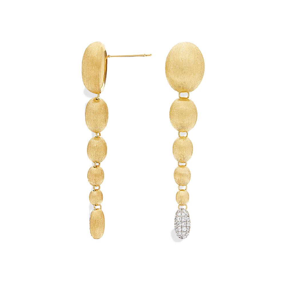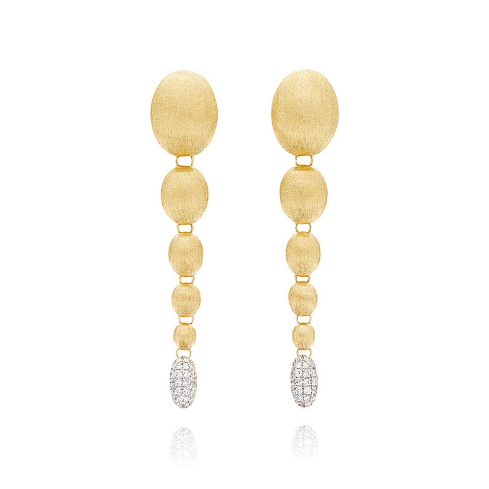 Elegant 18kt gold boules, hand-engraved with artisanal wisdom, chase each other in these contemporary earrings crowned with a diamonds drop. Laura, who tests each of her creations, has created special butterflies for these earrings, equipped with a little plate to support the upper part of the earring, ensuring a perfect wearability.