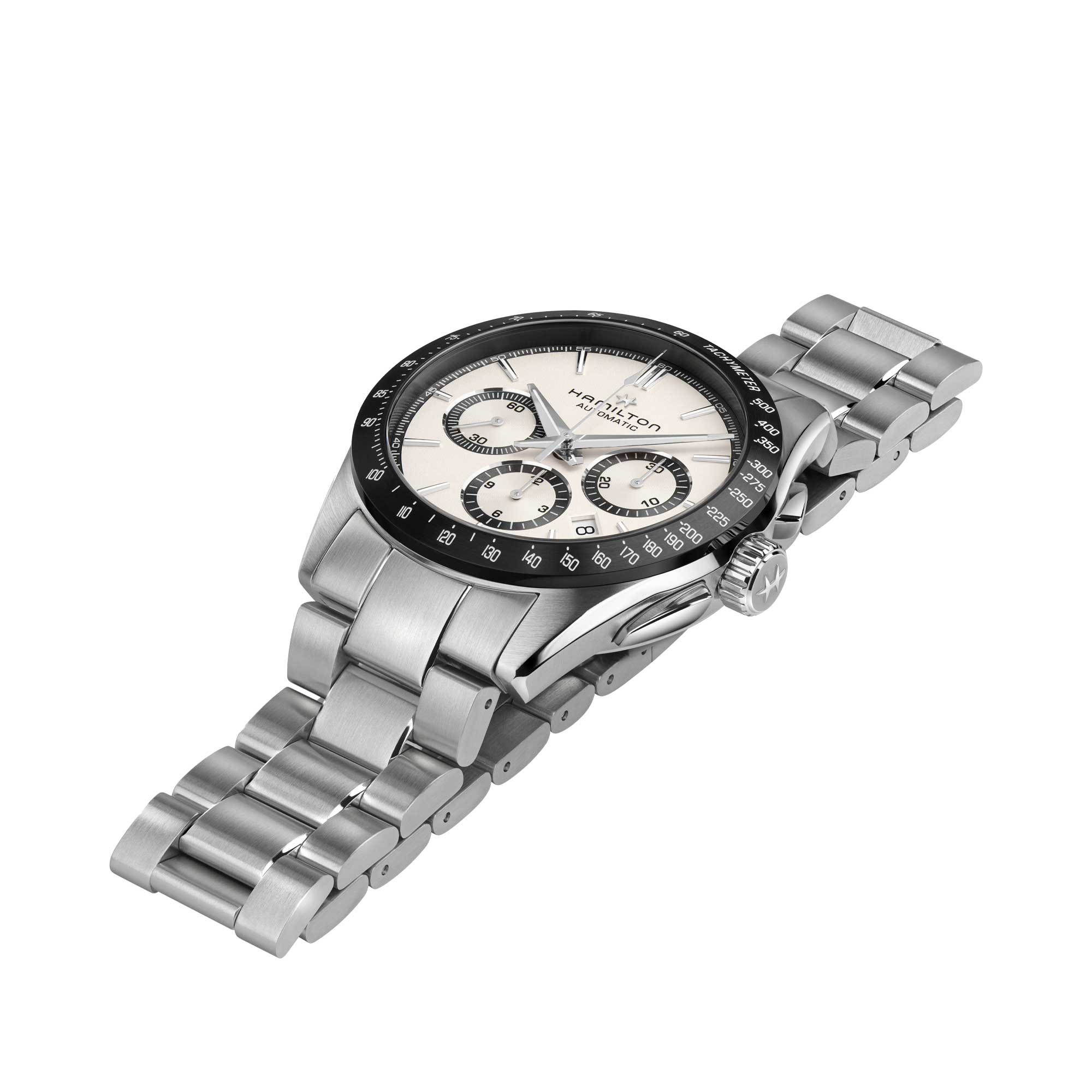 Powered by the H-31 automatic chronograph movement with 60-hour power reserve, the Jazzmaster Performer Automatic Chronograph features a 42 mm steel case set off by a classic white dial with contrasting black bezel and a boldly styled steel bracelet.