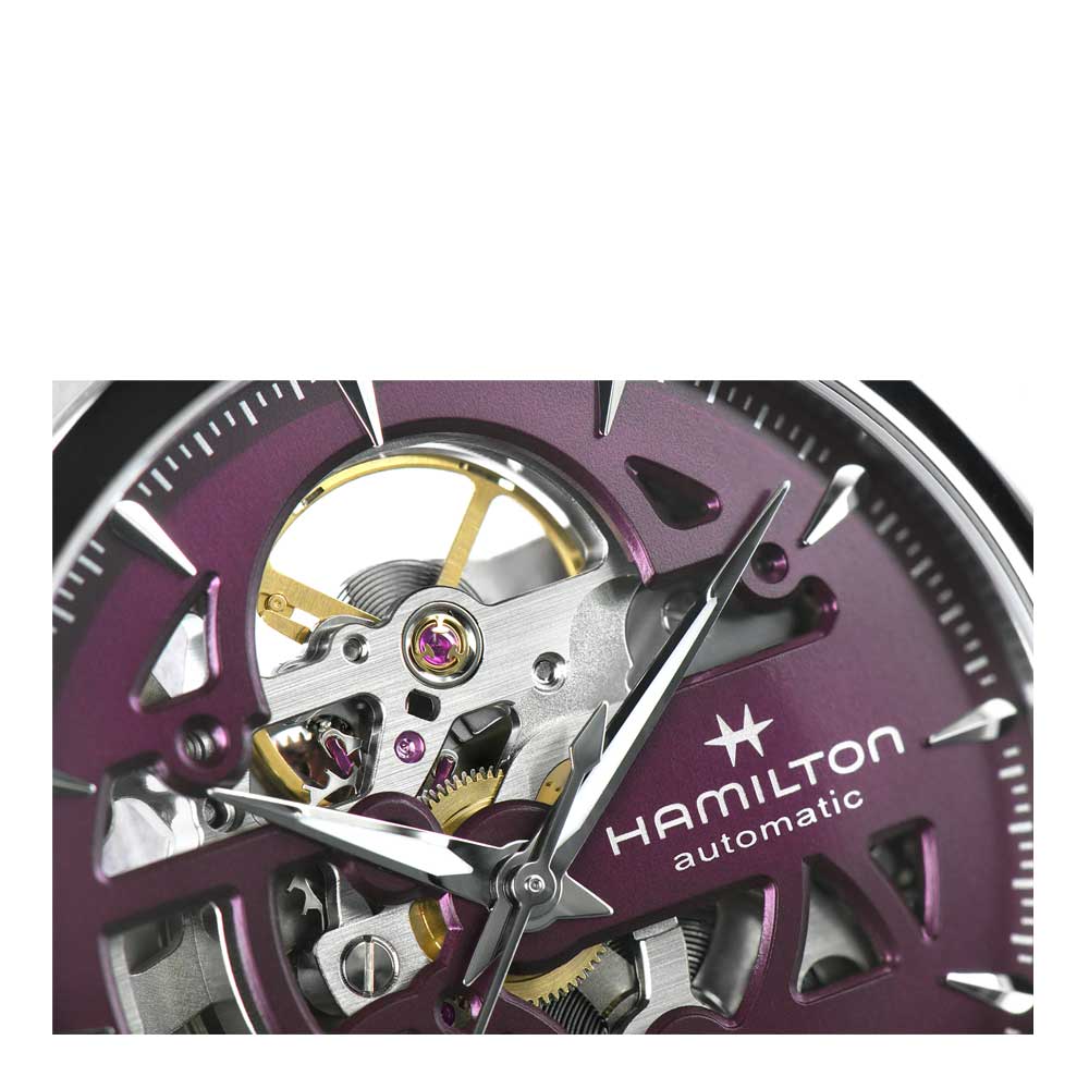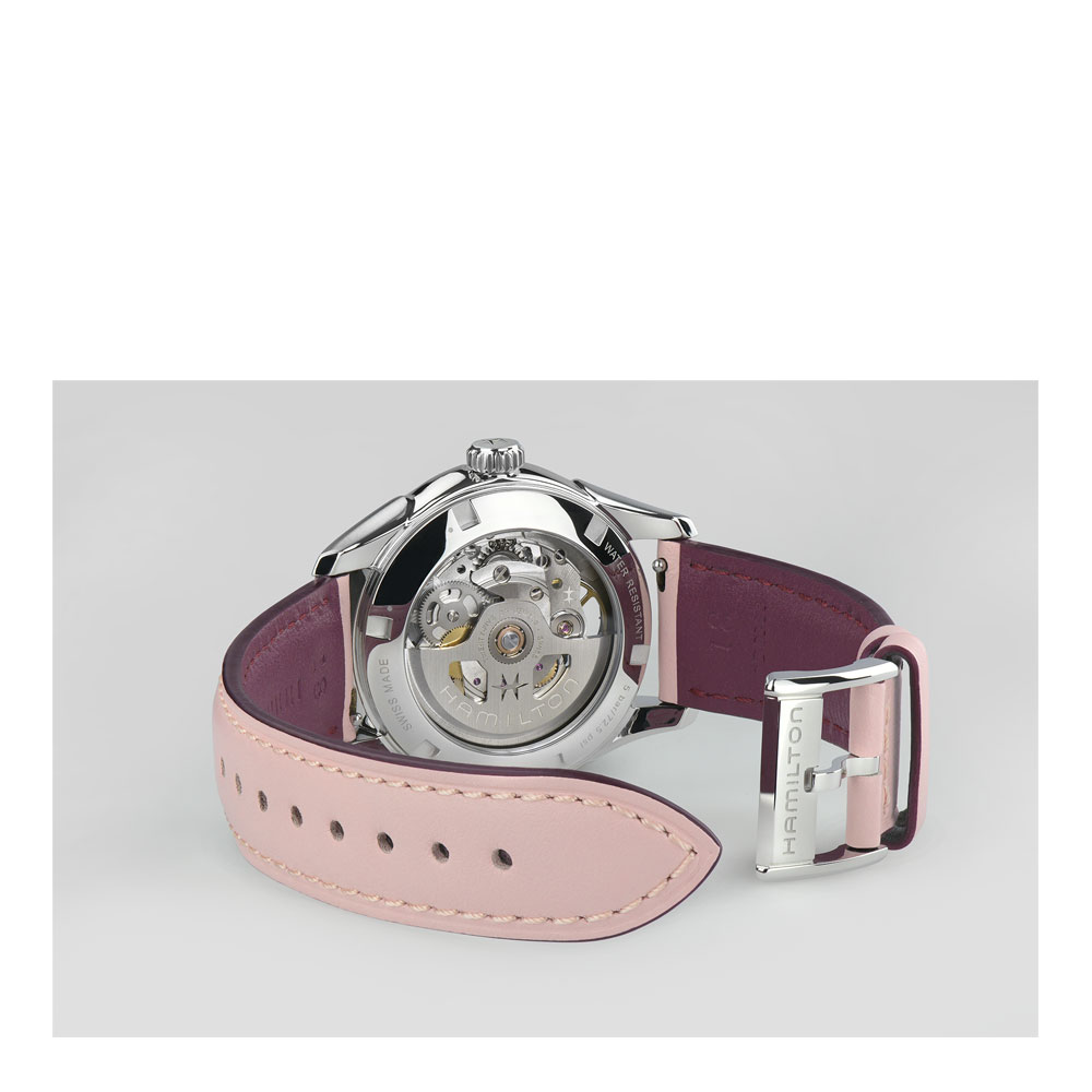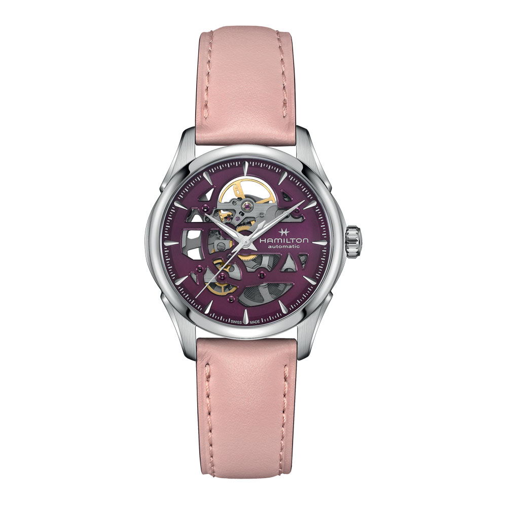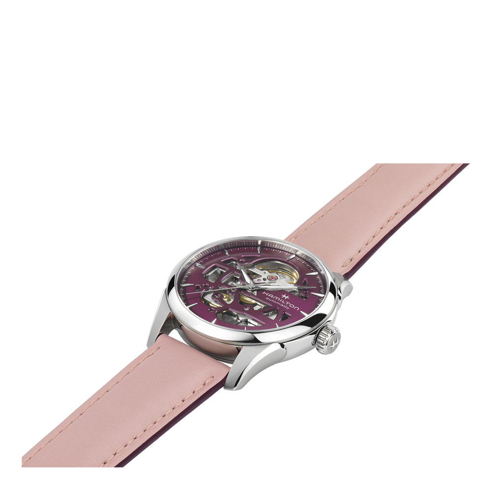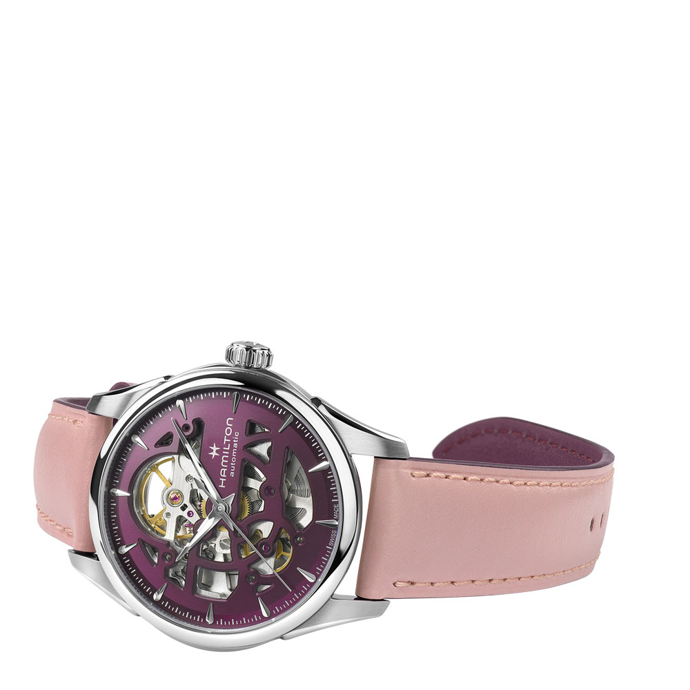 Let precision take centre stage with the 36mm Jazzmaster Skeleton and its purple cut-out dial, revealing the subtle beauty of this timepiece’s inner mechanics. Bringing the H-10-S automatic movement into the spotlight, with an 80 hour power reserve and Nivachron™ balance spring, the Jazzmaster Skeleton is fitted with a delicate pink leather strap, showcasing Hamilton’s ever-evolving craftsmanship and attention to detail.