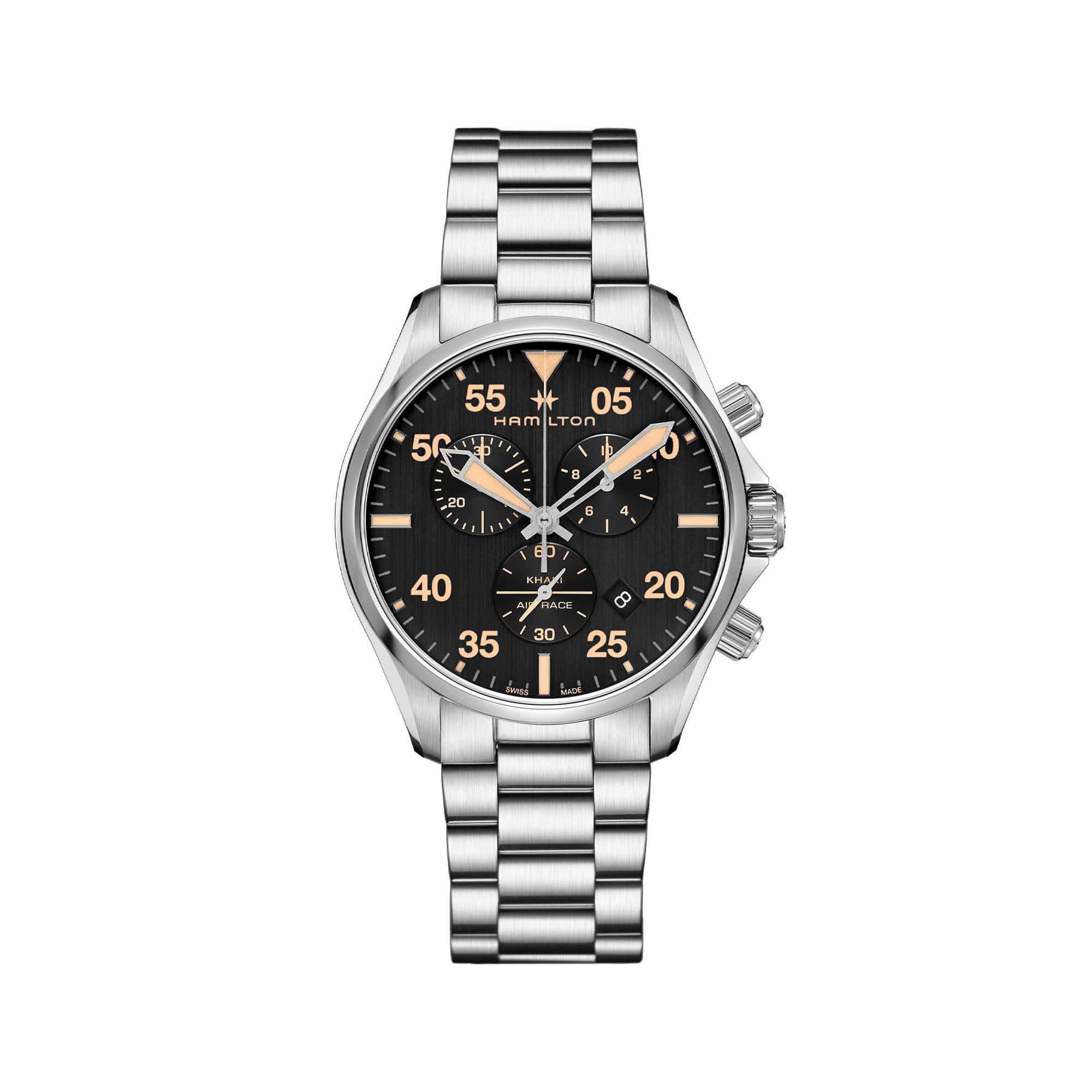 Created especially for pilots, this sporty quartz chronograph in a 44 mm steel case is a perfect blend of aeronautical style and Swiss precision. The elegant black dial features contrasting numbers, hourmarkers and hands in sand-coloured Super-LumiNova®, a nod to the aircraft control panel that will keep you flying even with your feet firmly on the ground.