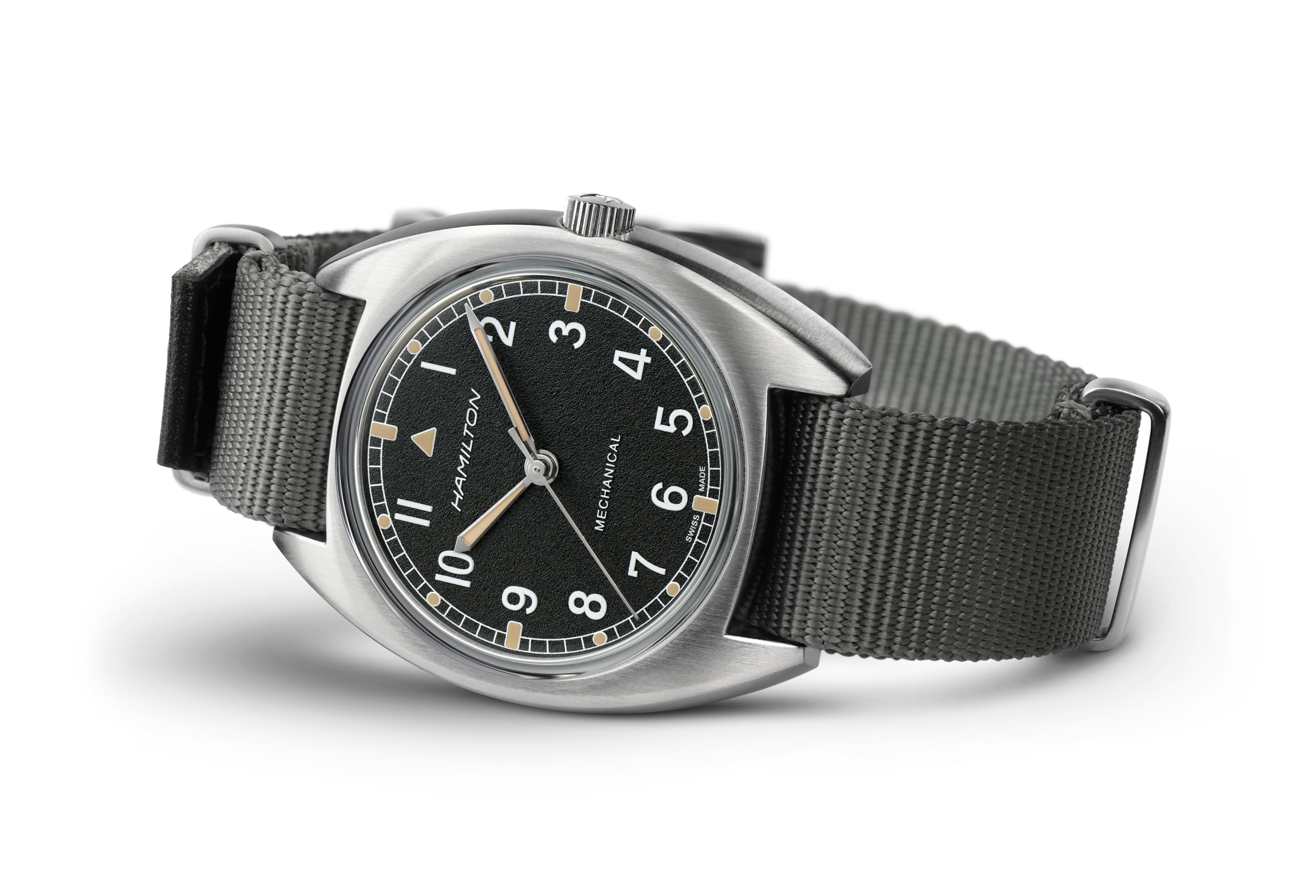 Powered by the awesome H-50 handwinding movement with 80 hours of power reserve, the Khaki Pilot Pioneer is a reinterpretation of a vintage military watch produced for the British Royal Air Force in 1973. Featuring a distinctive dial pattern and robust NATO strap, this is a military watch with real character.