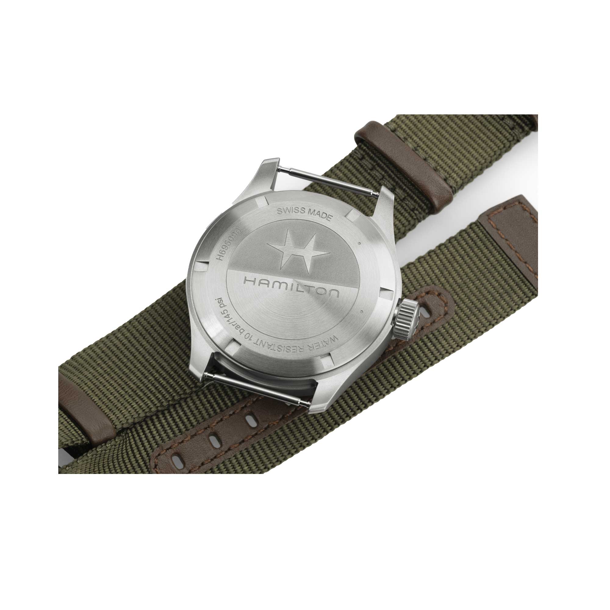 The Khaki Field Mechanical Power Reserve 40 mm, with a hand-wound H-23 movement developed by ETA exclusively for Hamilton, allows the 80-hour power reserve to be displayed directly on the dial for the first time.