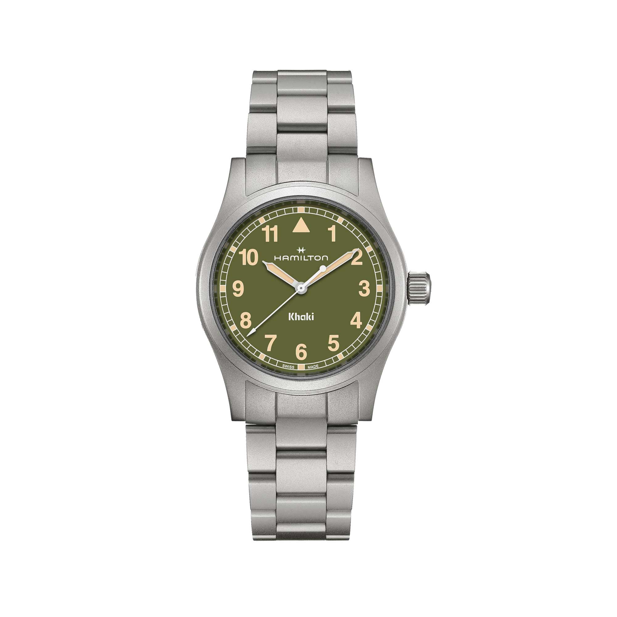 Primed for adventure, the Khaki Field Quartz is a reliable and rugged companion ready for exploration. Taking inspiration from Hamilton’s reputation for precision, innovation and utility-focused design, the Khaki Field Quartz pairs a 38mm khaki green dial with a modern metal bracelet. Discover our Khaki Field collection.