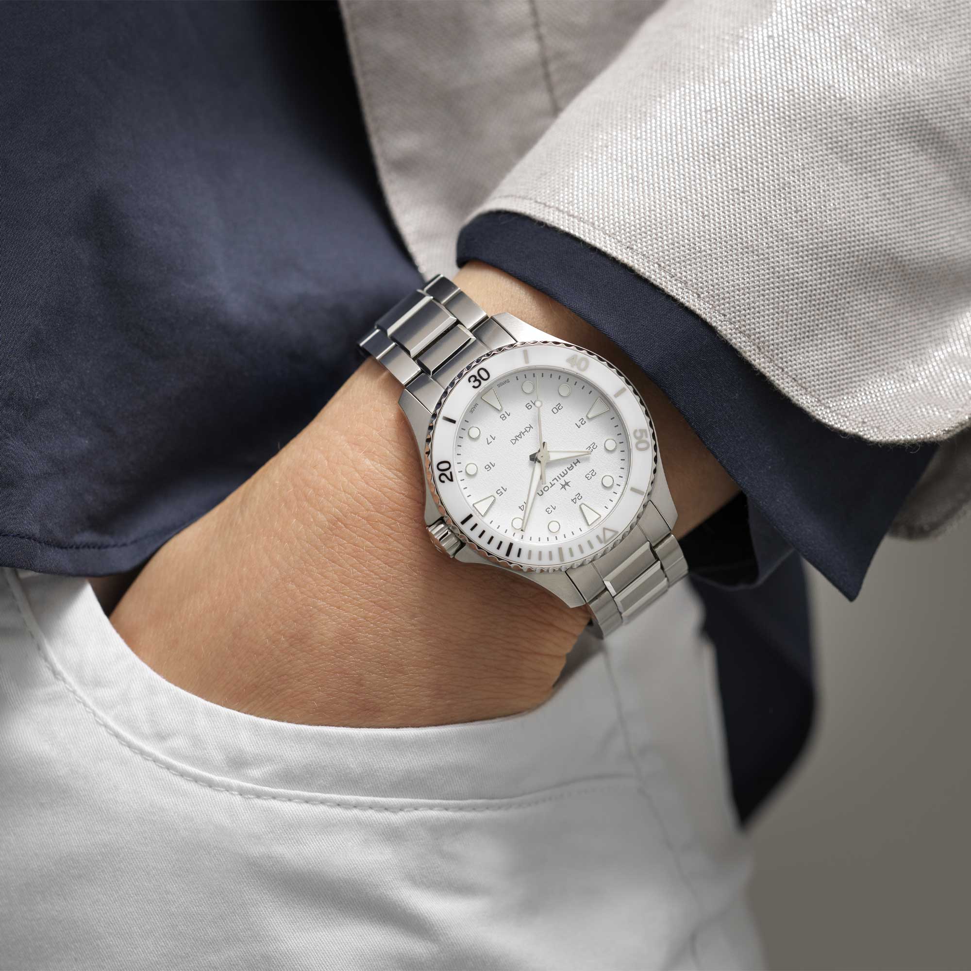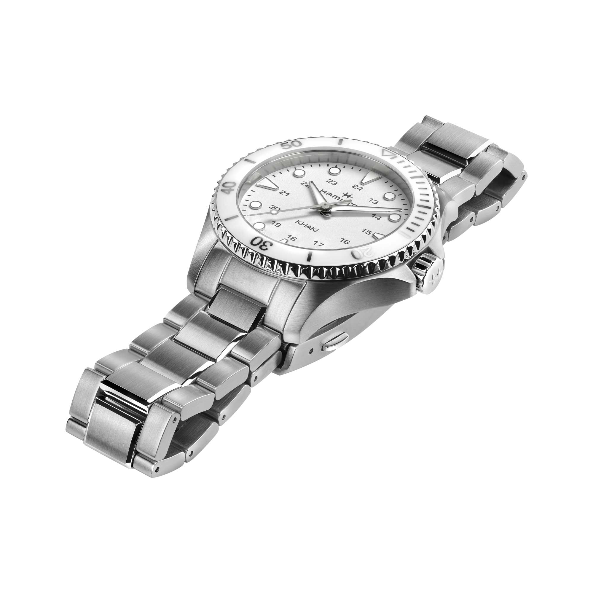 Seize the moment with the stunning total white Khaki Navy Scuba Quartz! The 37 mm ceramic bezel with engraved numerals makes it the perfect underwater timepiece for marine explorers, protecting it from corrosive elements such as sand and salt.