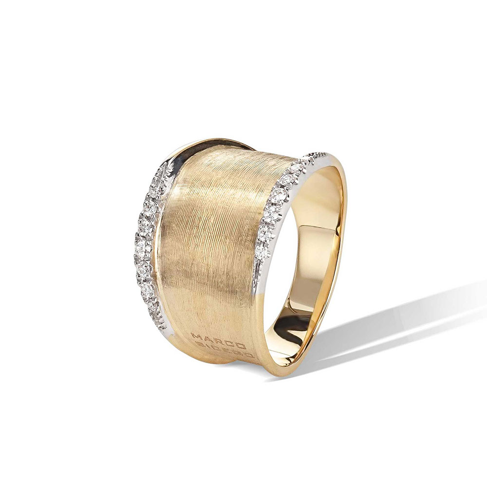 Featuring an irregular surface and linear design, this 18kt yellow gold diamond band ring has been finely hand-engraved using an ancient Florentine technique and is embellished by elegant side profiles featuring a brilliant-cut diamond pavé.