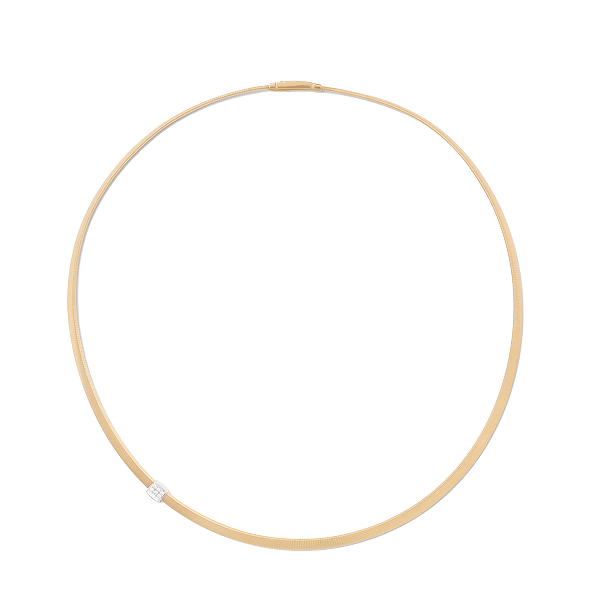 Classically linear in design, this 18kt yellow gold flat-coil necklace is embellished by an elegant brilliant-cut diamond pavé element.