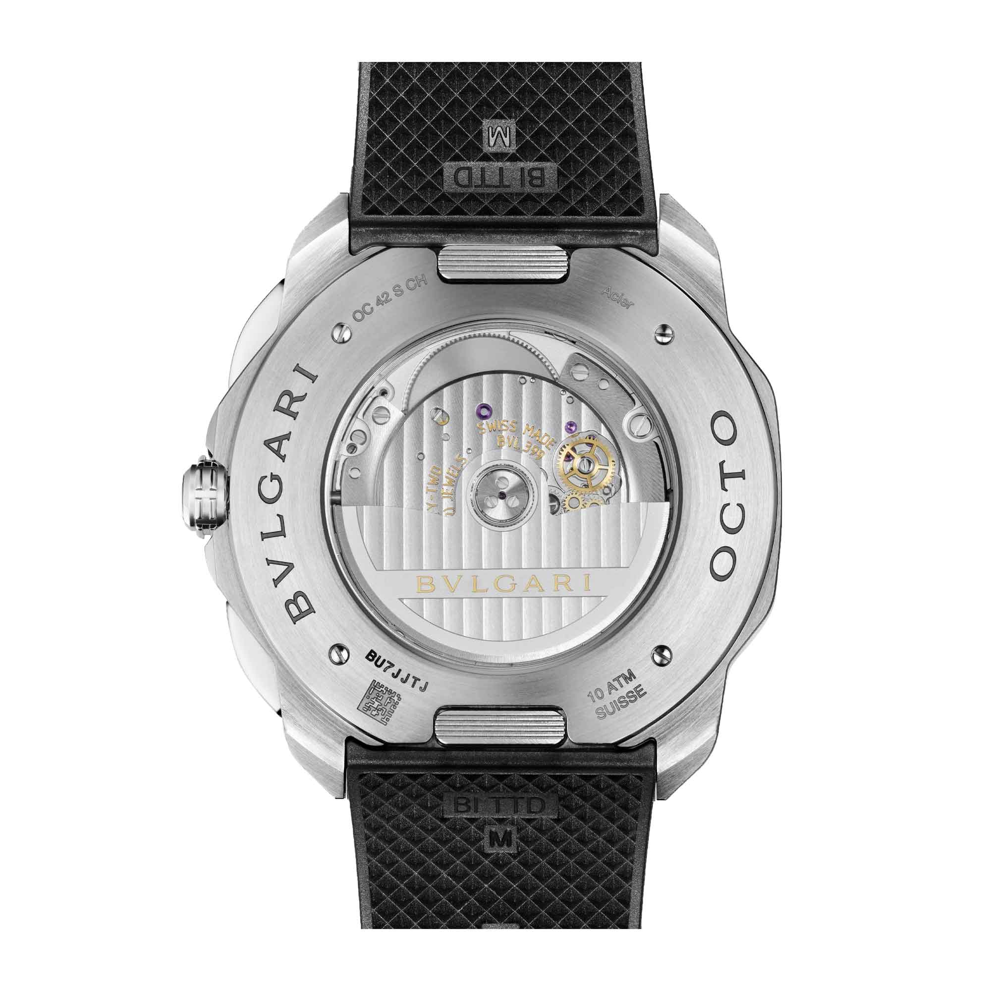 Form, function, design and ergonomics merge into a coherent and harmonious whole. Octo Roma Chronograph watch with mechanical manufacture movement, automatic winding, hours, minutes, central seconds, date, chronograph functions, BVL399 calibre and 48 hours of power reserve. 41 mm satin-brushed and polished stainless steel case, black Clous de Paris dial, metallic indexes and hands filled with Super-LumiNova®, date opening at 4.3h o’clock, small seconds at 3 o’clock, chronograph hour at 6 o’clock and chronograph minutes at 9 o’clock, stainless steel screw crown with protective system, and interchangeable satin-brushed and polished stainless steel bracelet. Water-resistant up to 100 metres.