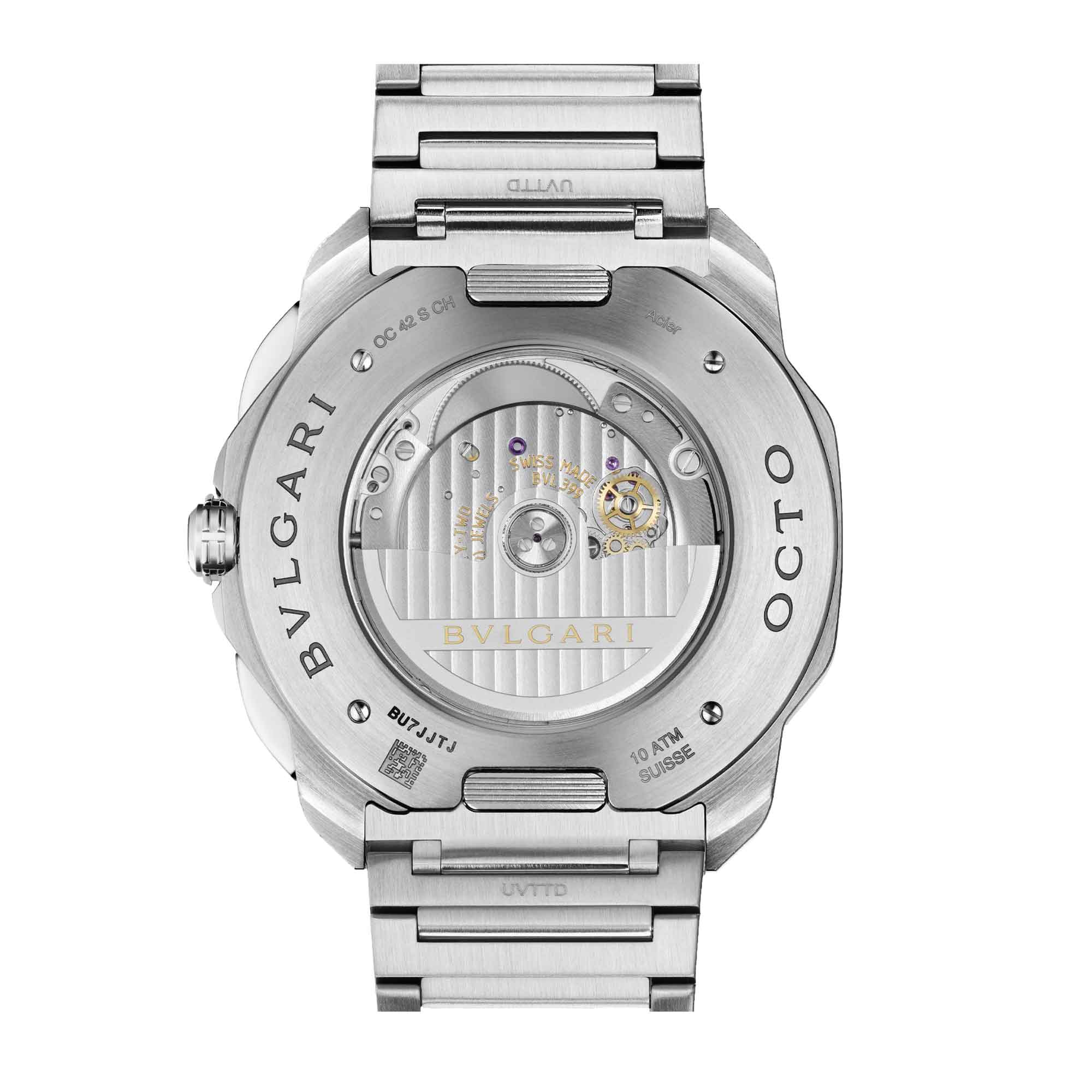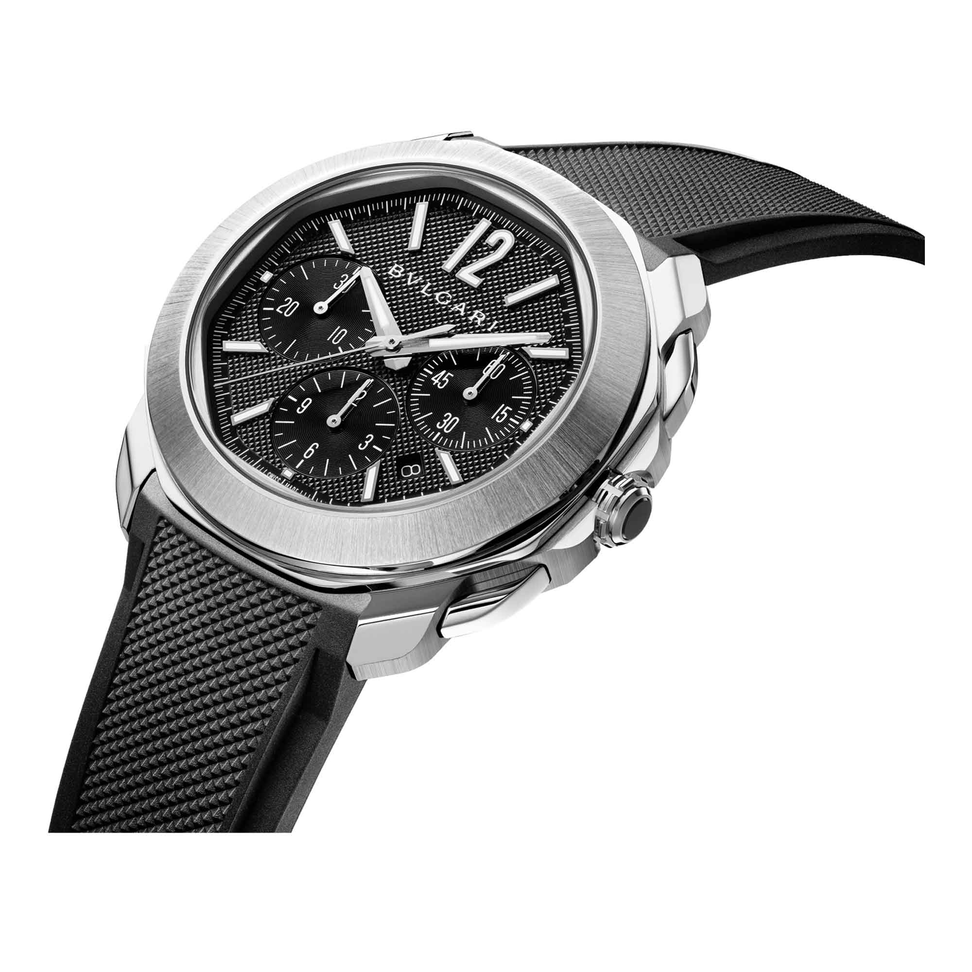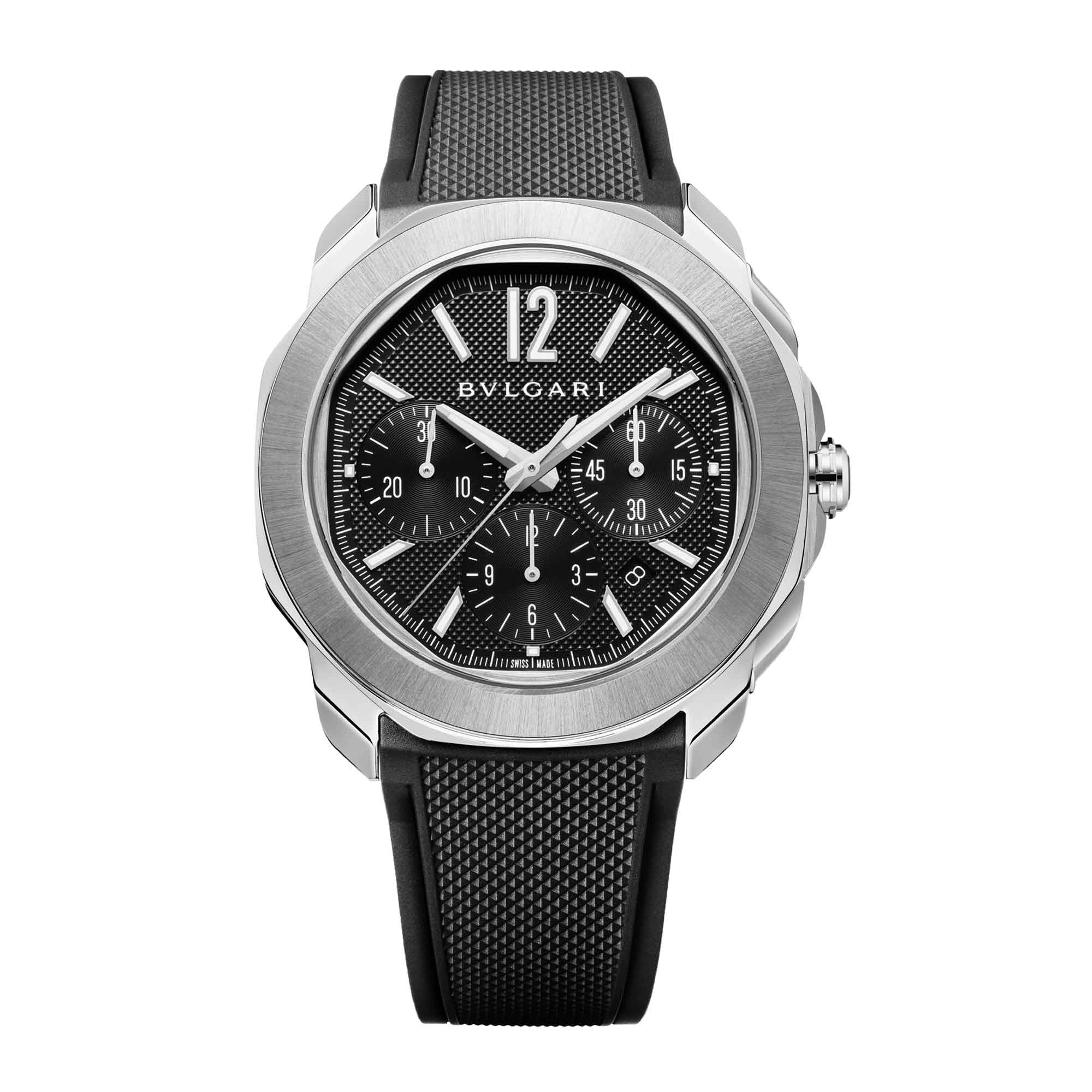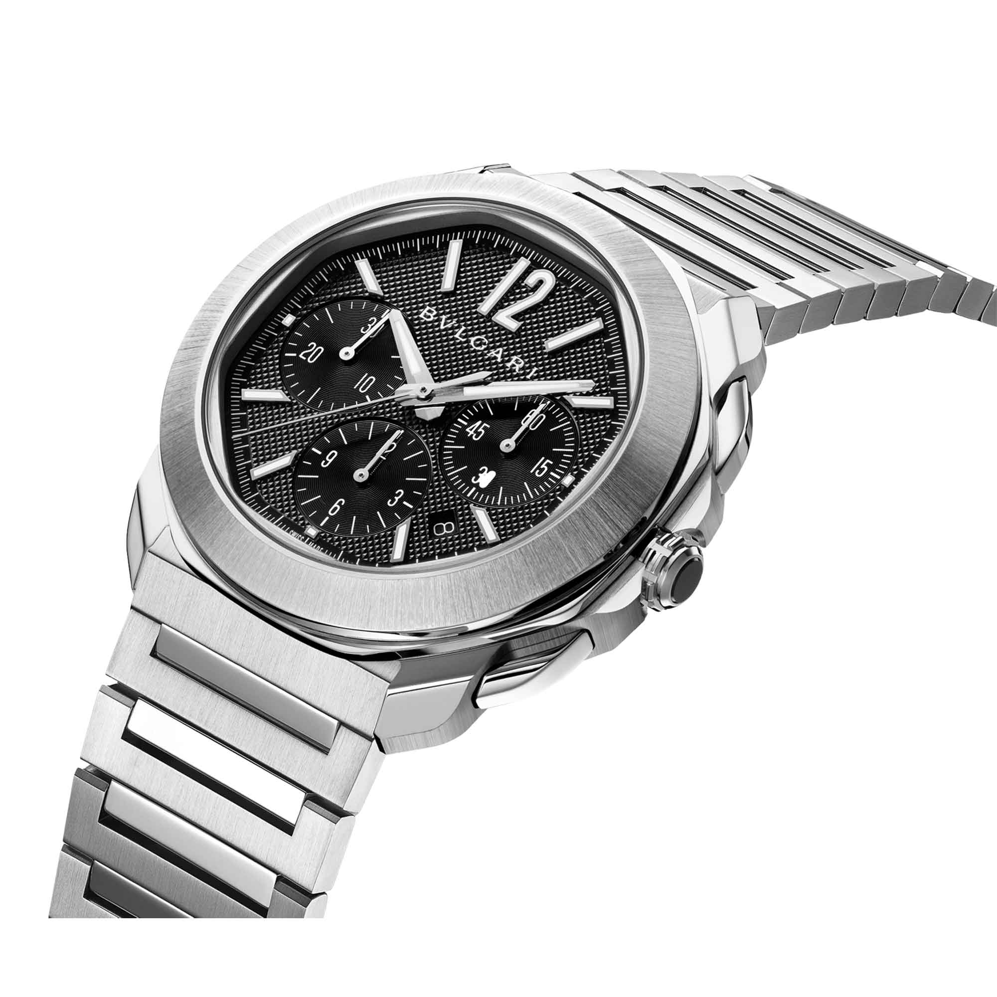 Octo Roma Chronograph watch with mechanical manufacture movement, automatic winding, hours, minutes, central seconds, date, chronograph functions, BVL399 calibre and 48 hours of power reserve. 41 mm satin-brushed and polished stainless steel case, black Clous de Paris dial, metallic indexes and hands filled with Super-LumiNova®, date opening at 4.3h o’clock, small seconds at 3 o’clock, chronograph hour at 6 o’clock and chronograph minutes at 9 o’clock, stainless steel screw crown with protective system, and interchangeable satin-brushed and polished stainless steel bracelet. Water-resistant up to 100 metres.