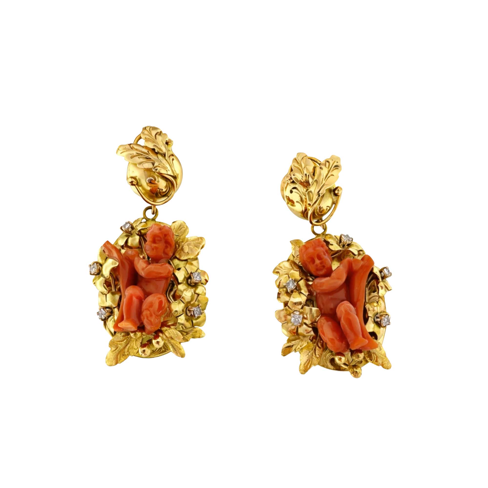 SKU: M442918-carat yellow gold earrings with engraved coral. Featuring a stud fastening and clips. 1970s. Total weight: 28 g.