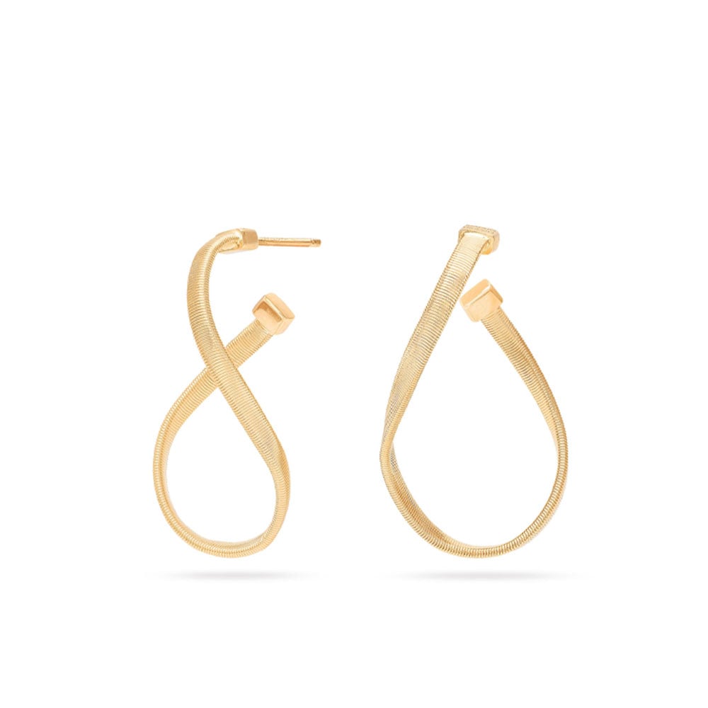 Subtle, elegant and full of finesse, these 18kt yellow gold hoop earrings feature a striking twisted coil into an irregular infinity shaped hoop. Light and refined, they are a timeless classic, perfect for adding a touch of light to any outfit.