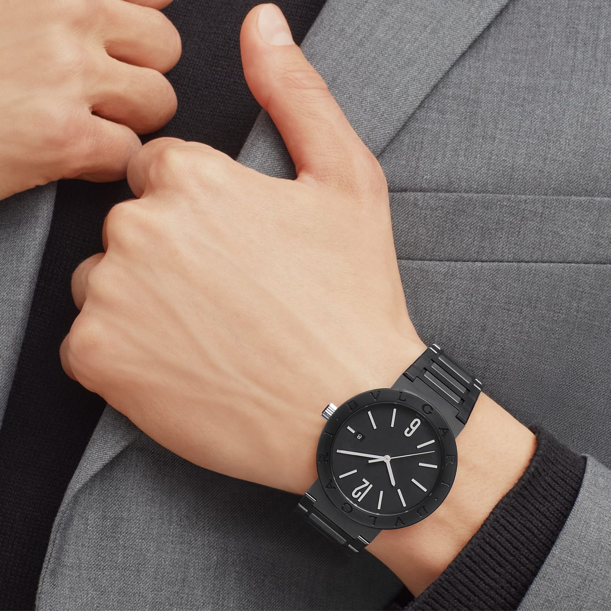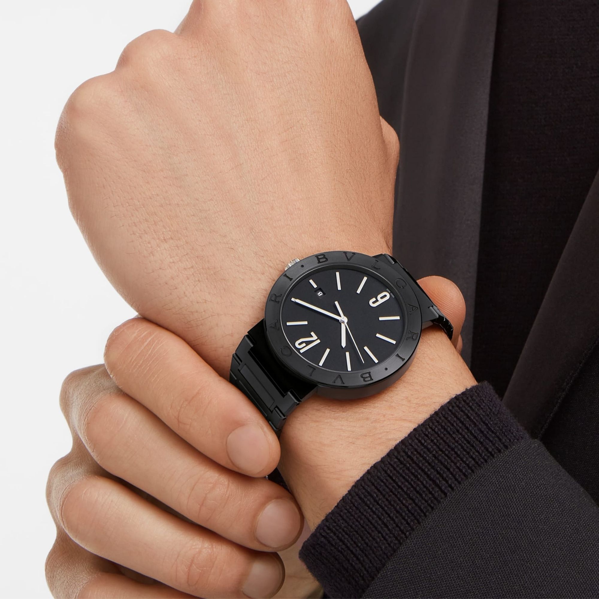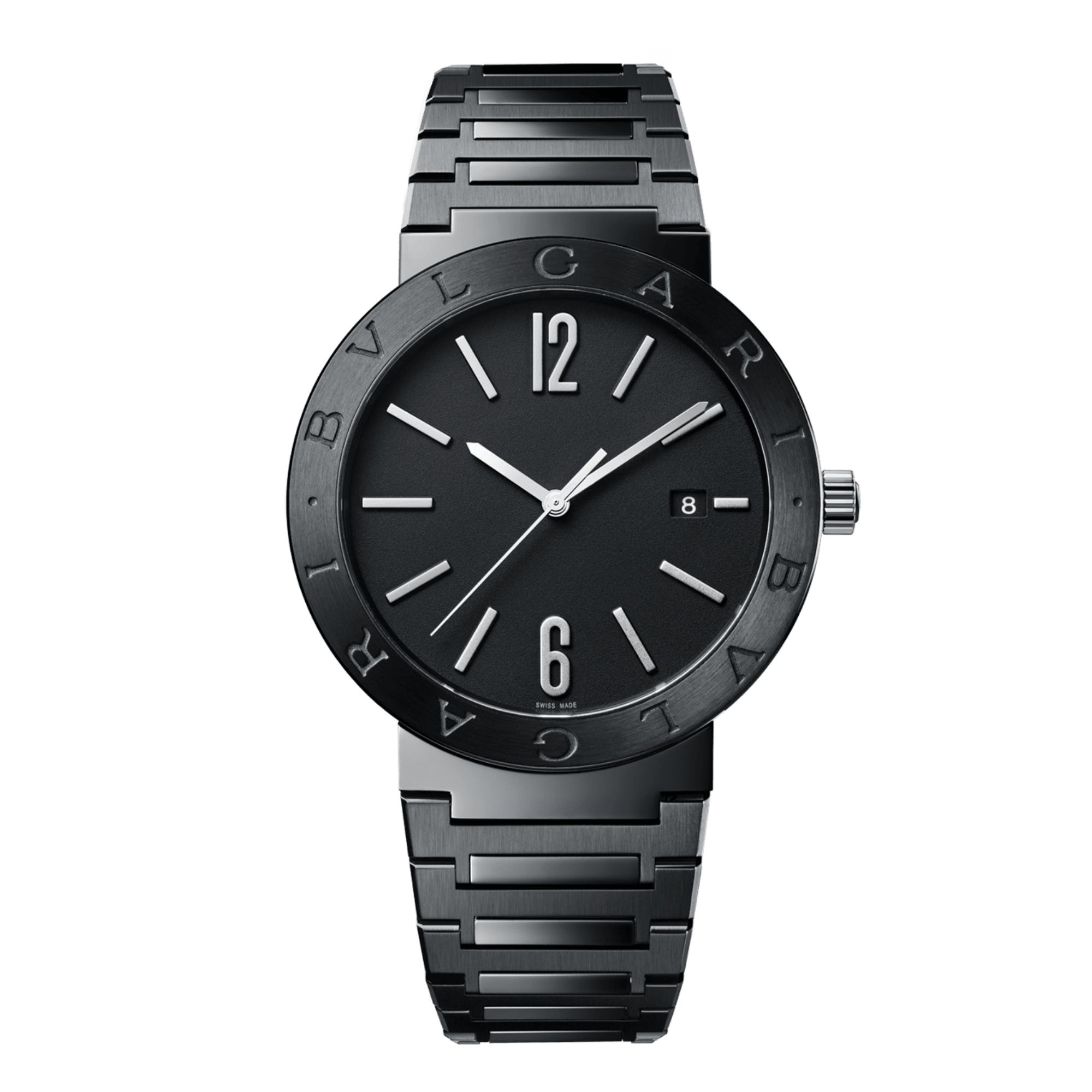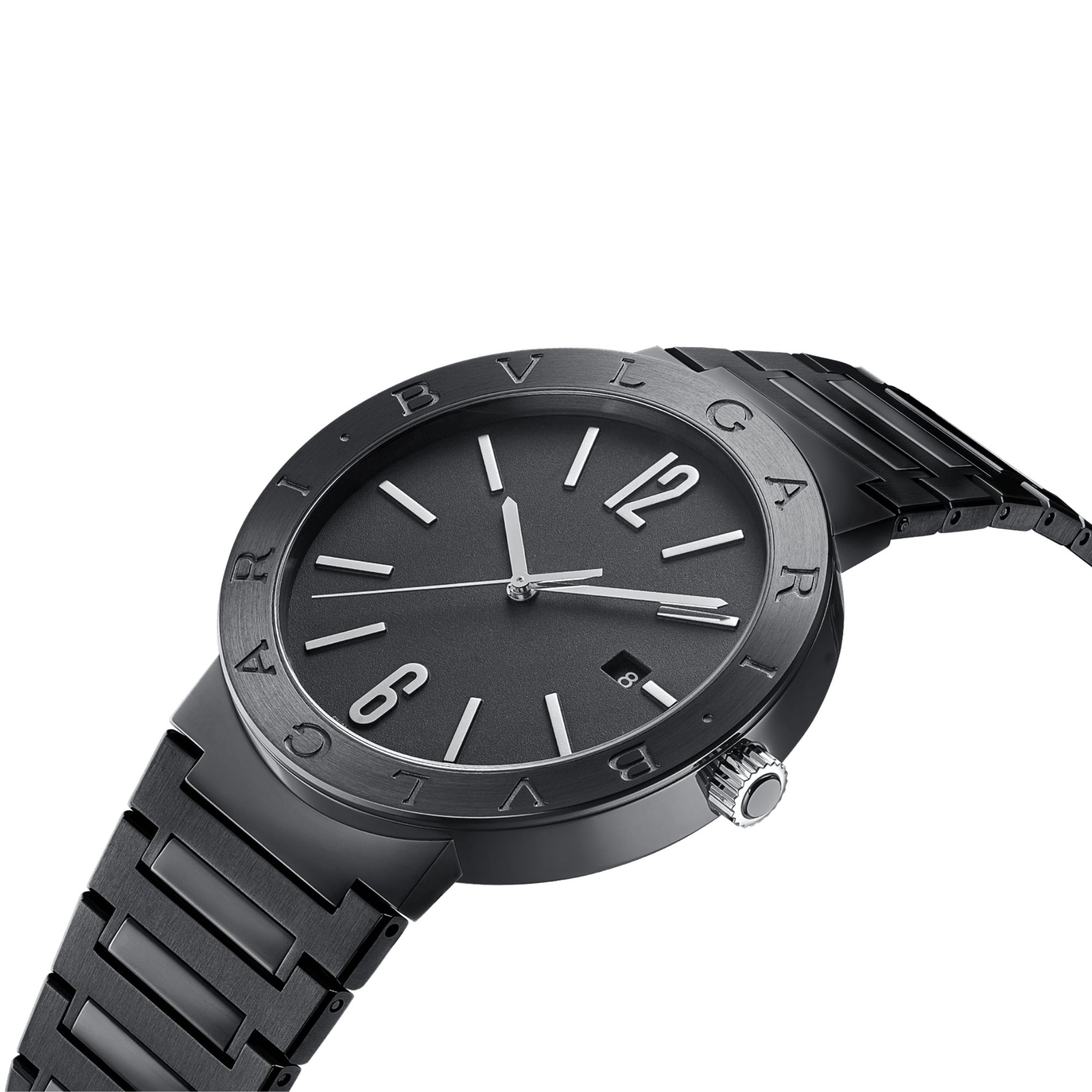 BVLGARI BVLGARI watch with in-house mechanical movement with automatic winding and date display, BVL 191 calibre – Solotempo (3.80 mm thick), 42-hour power reserve, 41 mm stainless steel case with Diamond-Like Carbon treatment, bezel with double logo, crown with black ceramic insert, black lacquered dial, stainless steel bracelet with folding clasp and DLC treatment. Water-resistant to 50 metres.