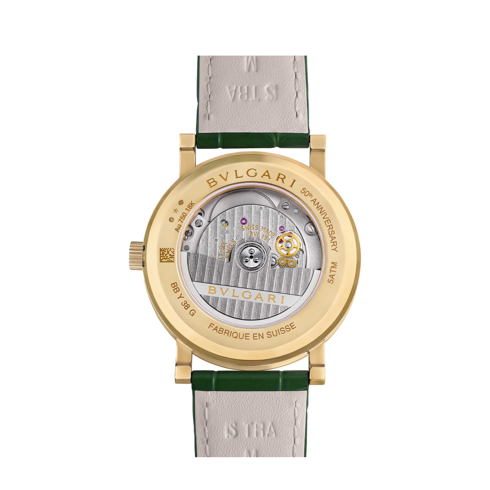 Bvlgari Bvlgari watch with mechanical in-house movement, automatic winding, hour and minute functions, BVL 191 calibre (3.80 mm thick), 28,800 VpH (4Hz) frequency and 42-hour power reserve. 38 mm 18 kt yellow gold case and bezel engraved with BVLGARI ROMA logo, Verde Alpi green marble dial, yellow gold plated hands, caseback customised with 50th anniversary engraving, 18 kt yellow gold crown, dark green alligator bracelet and 18 kt yellow gold pin buckle. Water-resistant up to 50 metres. Limited Edition of 150 pieces.