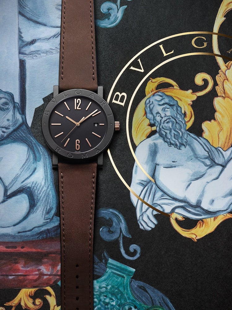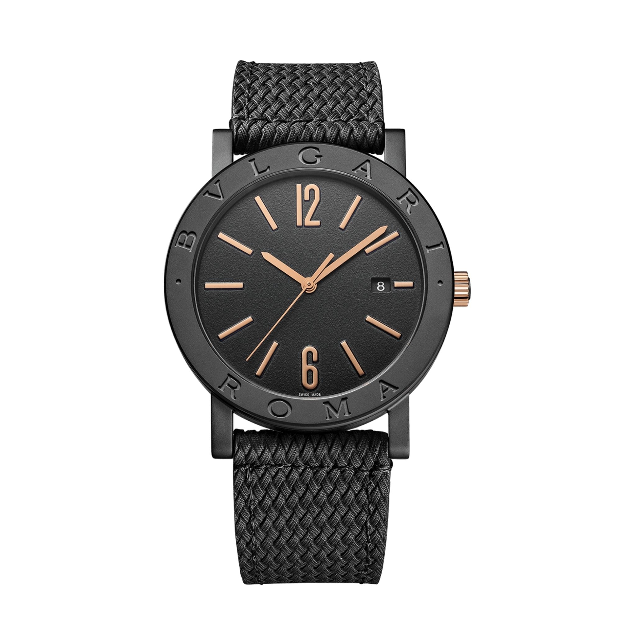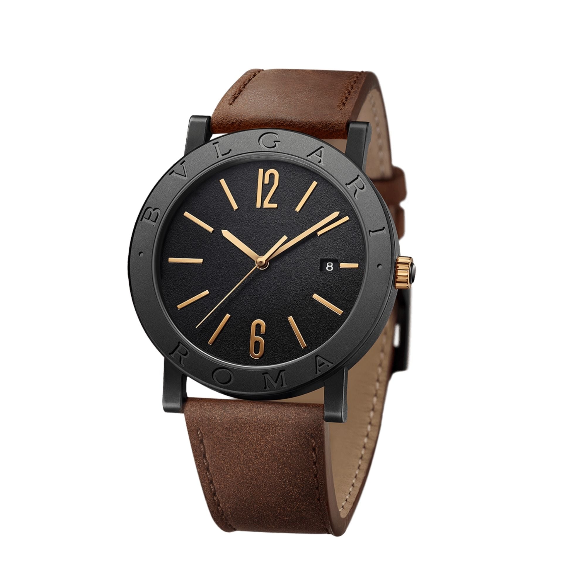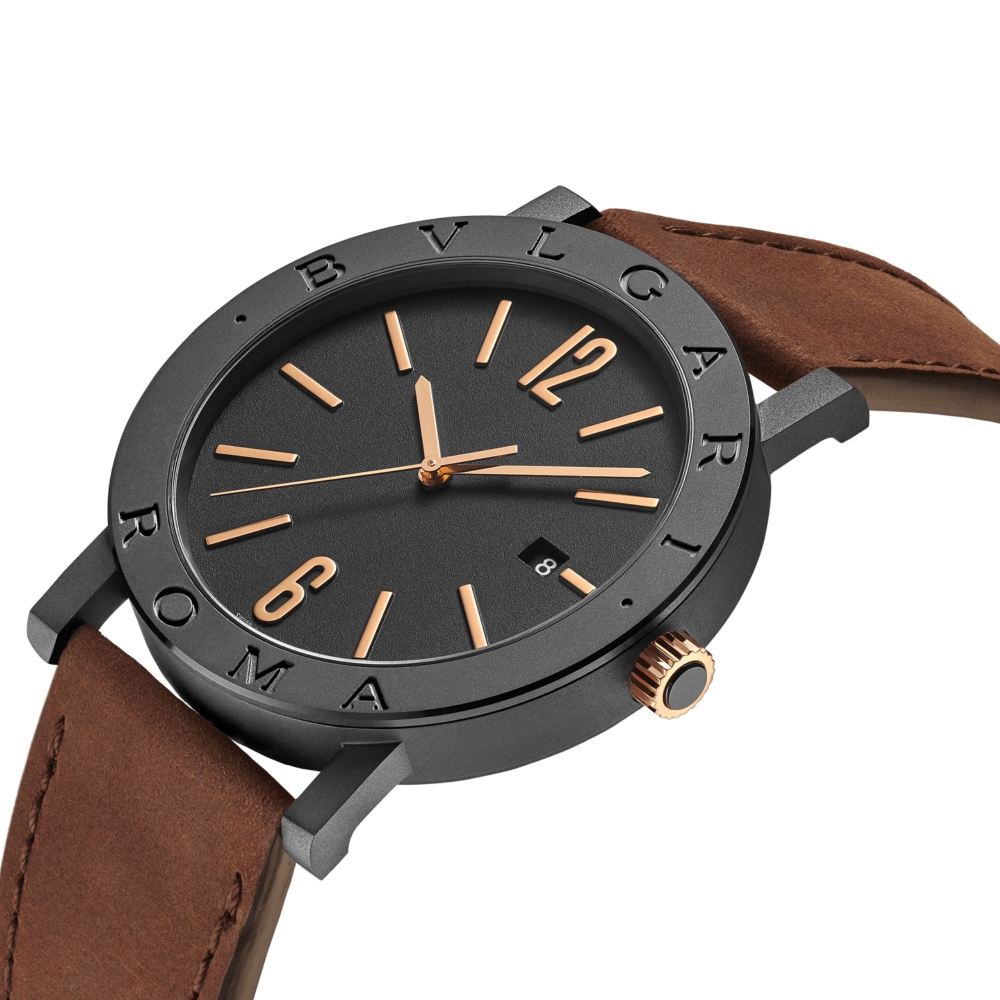 BVLGARI BVLGARI Cities Special Edition ROMA watch with in-house mechanical movement with automatic winding, BVL 191 caliber, 41 mm stainless steel case with black Diamond-Like Carbon treatment, bezel engraved with “BVLGARI ROMA”, visible case back, 18 kt rose gold crown, black lacquered grené dial, rose gold indexes, date display at 3 o’clock, brown calfskin strap and interchangeable black rubber strap with pin buckle. Water resistant to 50 meters. Special edition with travel pouch, in black grained leather.