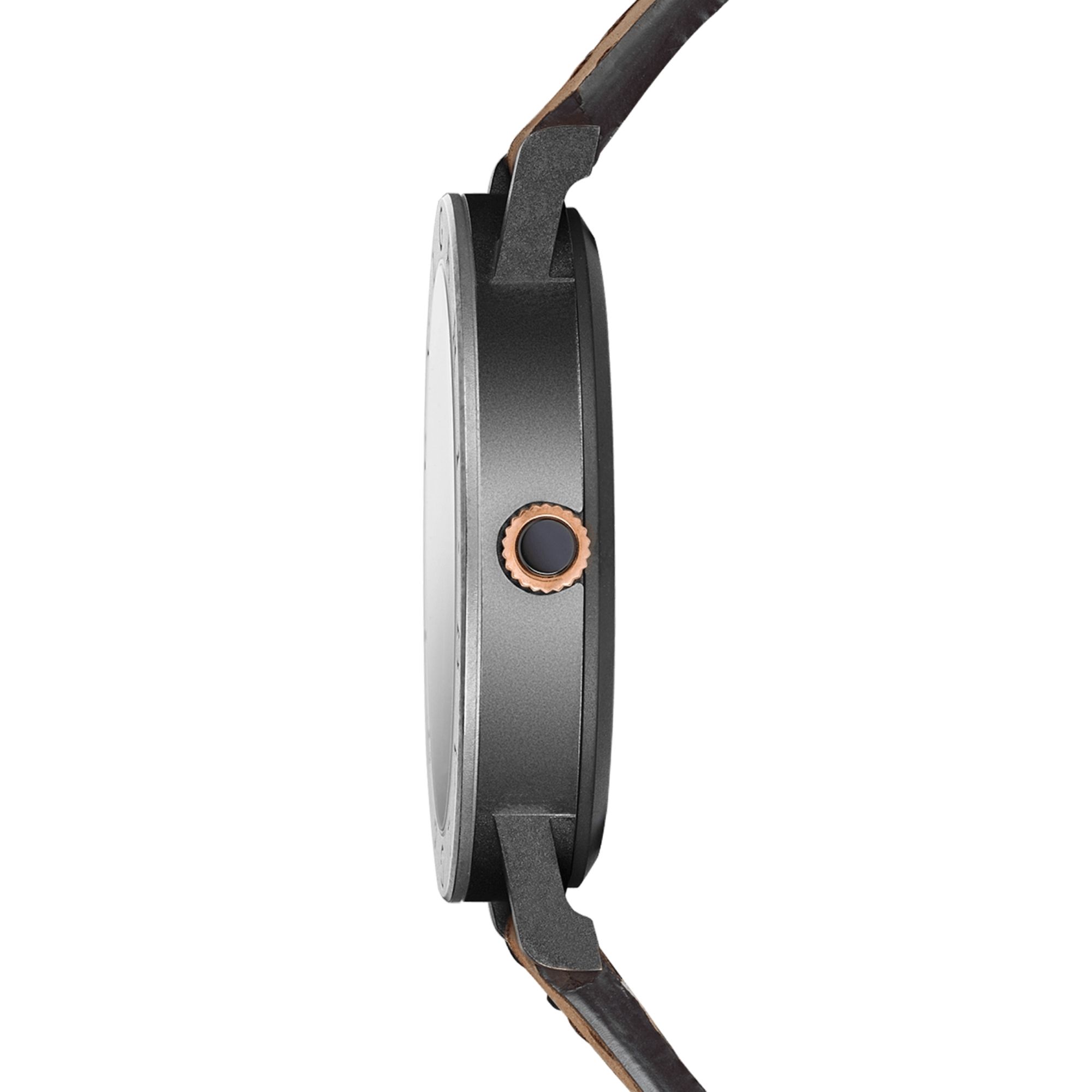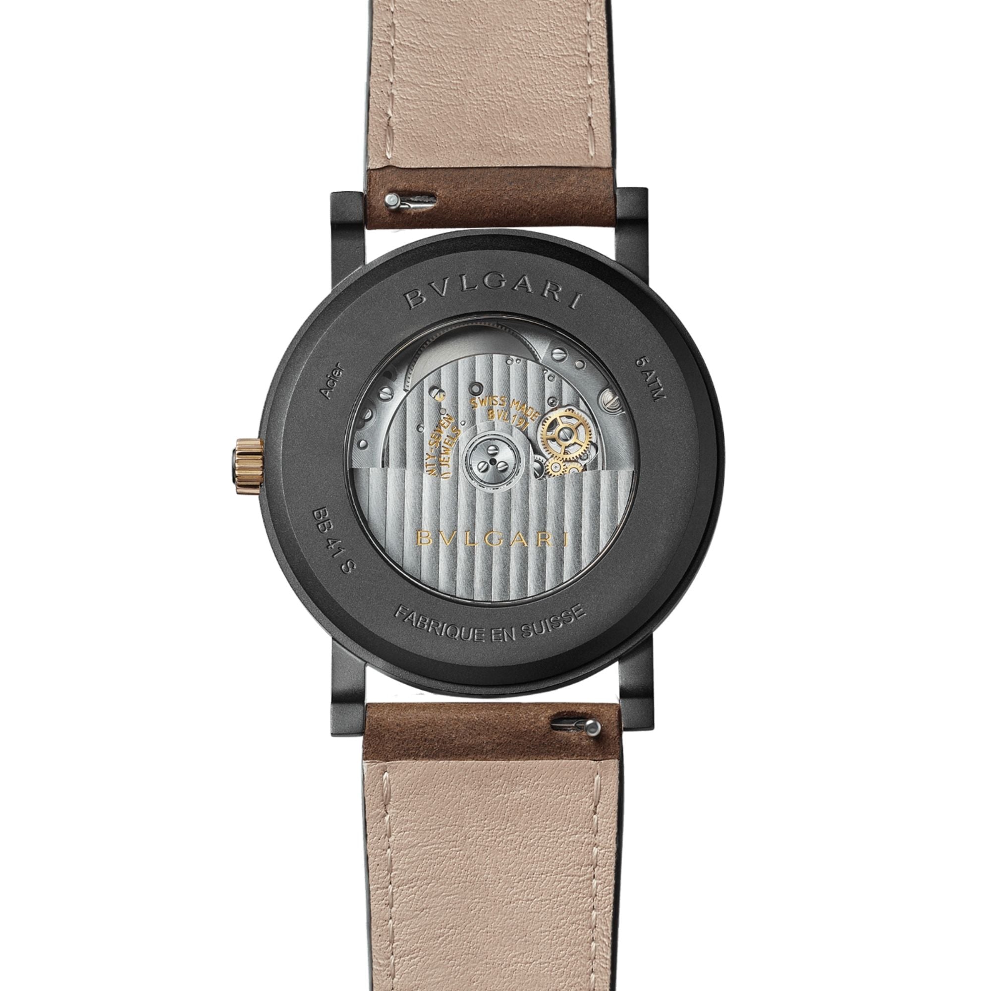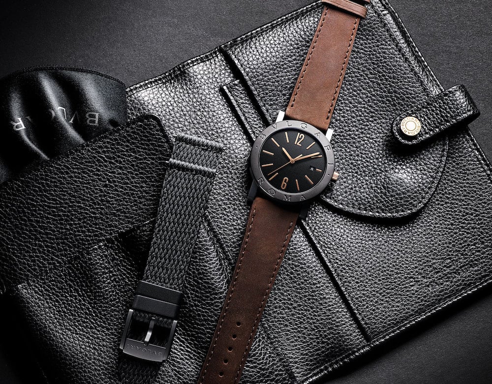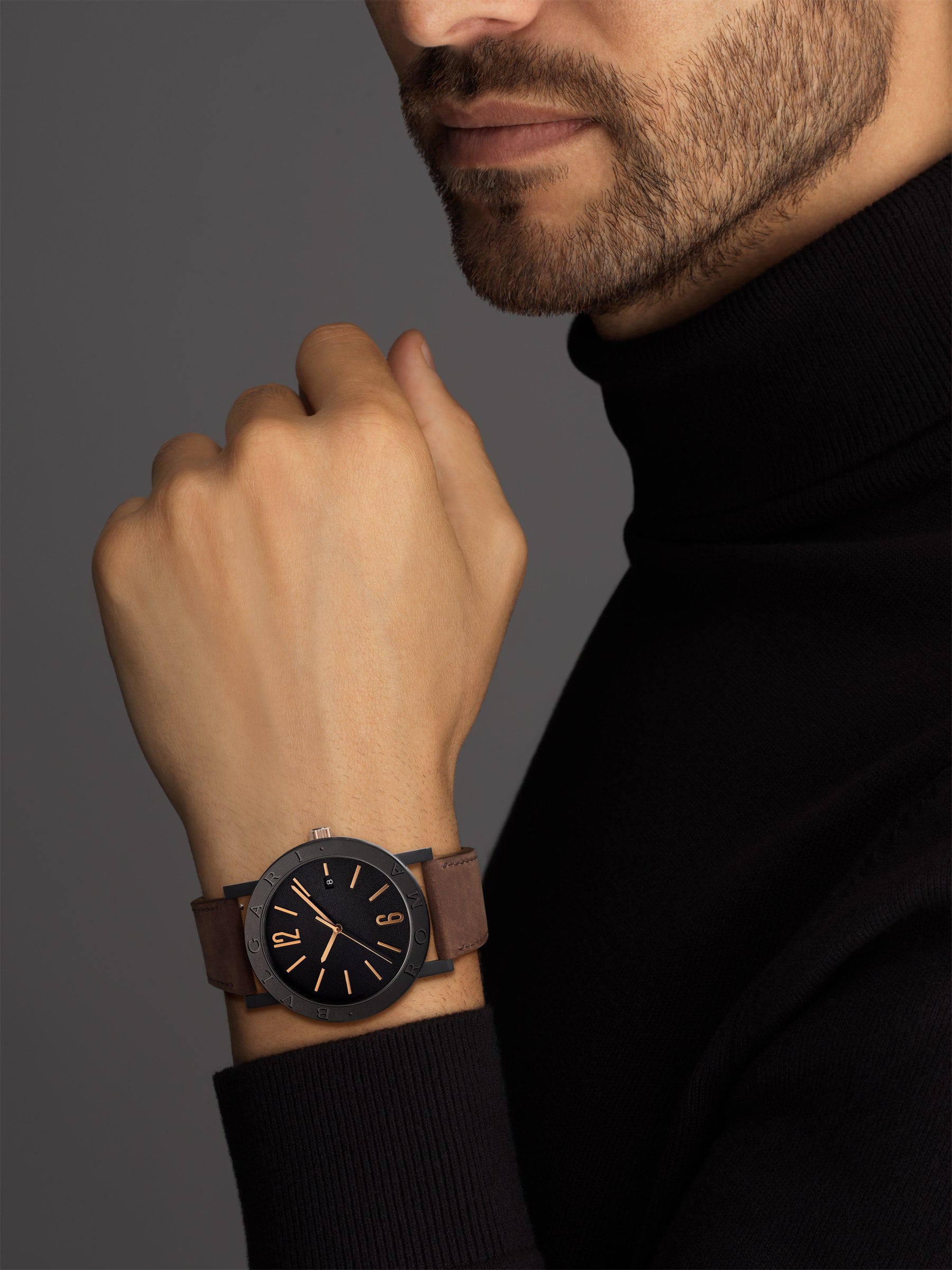 BVLGARI BVLGARI Cities Special Edition ROMA watch with in-house mechanical movement with automatic winding, BVL 191 caliber, 41 mm stainless steel case with black Diamond-Like Carbon treatment, bezel engraved with “BVLGARI ROMA”, visible case back, 18 kt rose gold crown, black lacquered grené dial, rose gold indexes, date display at 3 o’clock, brown calfskin strap and interchangeable black rubber strap with pin buckle. Water resistant to 50 meters. Special edition with travel pouch, in black grained leather.