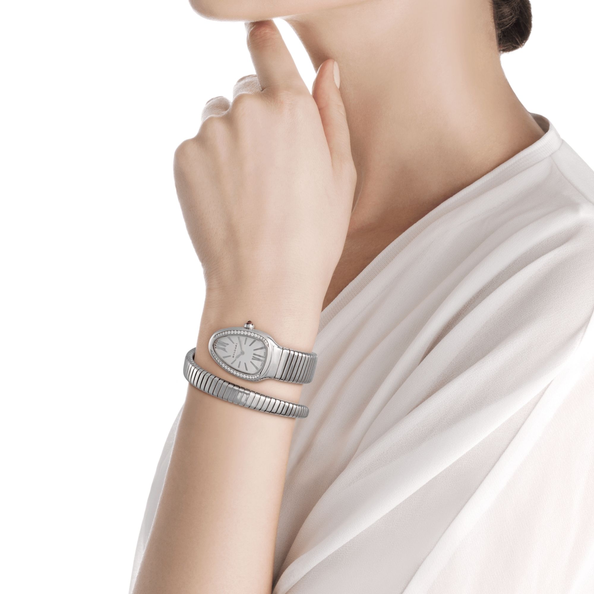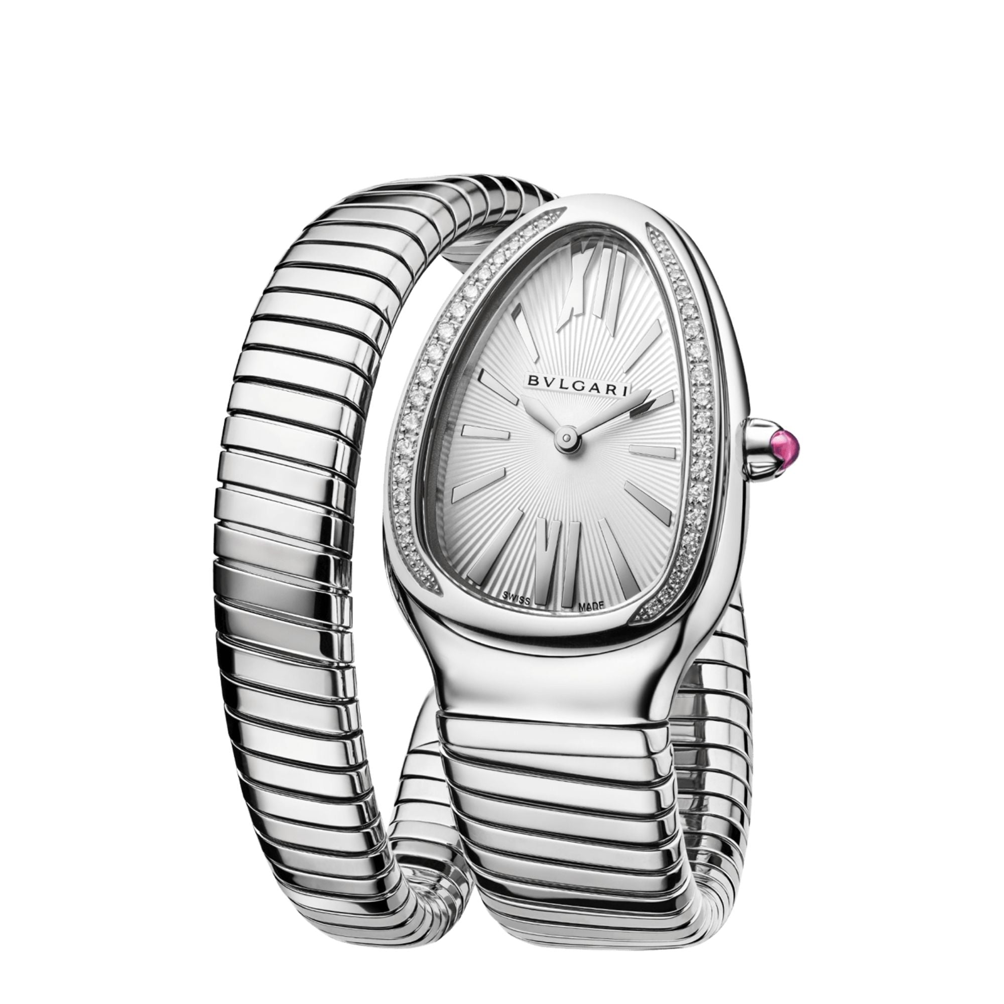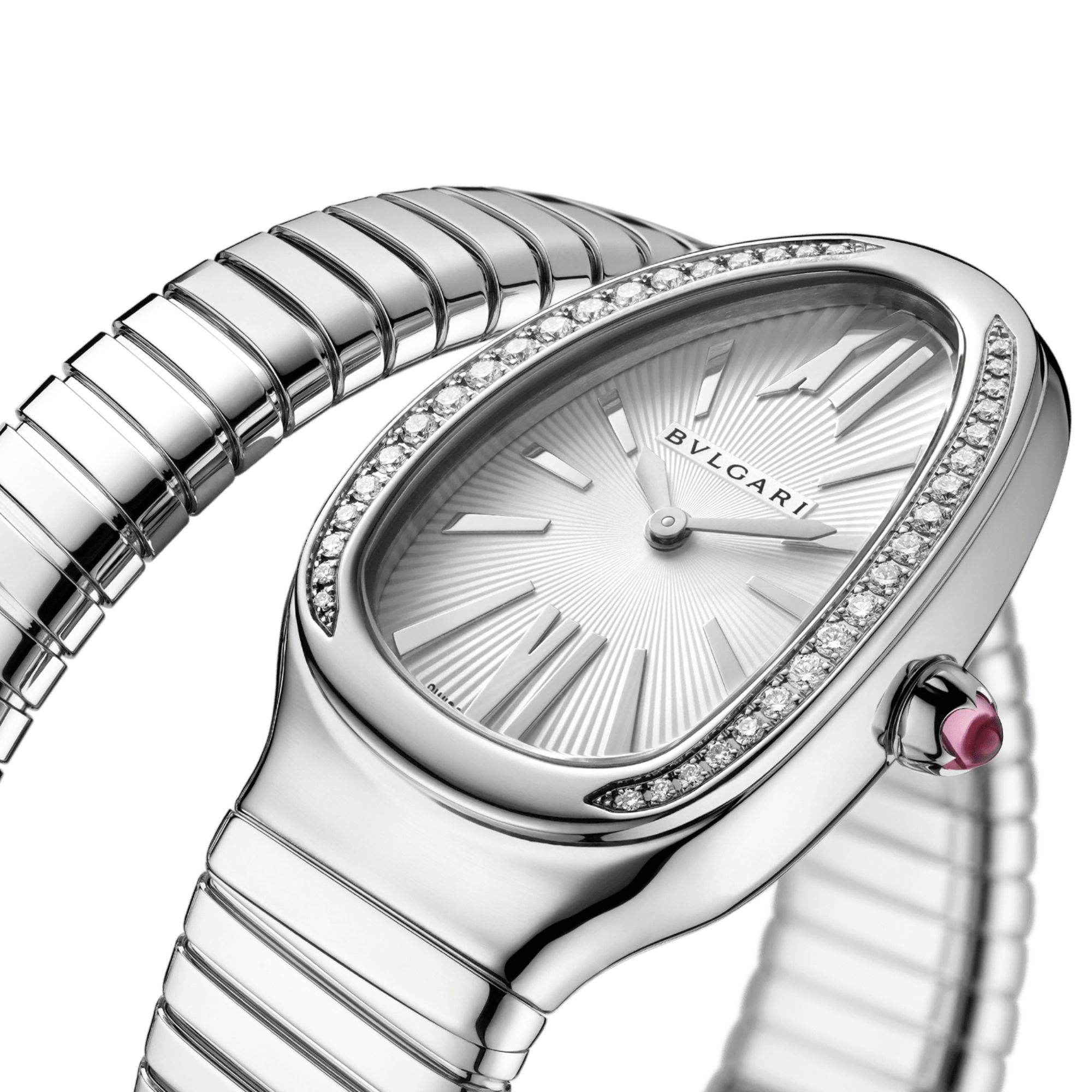 Combining two of Bulgari’s most iconic design symbols, the Serpenti Tubogas watch combines the sinuosity of the snake with the contemporary appeal of Tubogas. A perfect harmony of tubular shapes that evoke the sensuality of feminine curves and the supple elegance of the snake. With its unique and captivating style, the watch renews the iconic appeal of an ever-evolving collection. Serpenti Tubogas watch with quartz movement, 35mm curved stainless steel case set with brilliant-cut diamonds, stainless steel crown set with cabochon-cut pink rubellite, opaline silver dial with sunburst guilloché finish and hand-applied indexes, stainless steel spiral bracelet.
