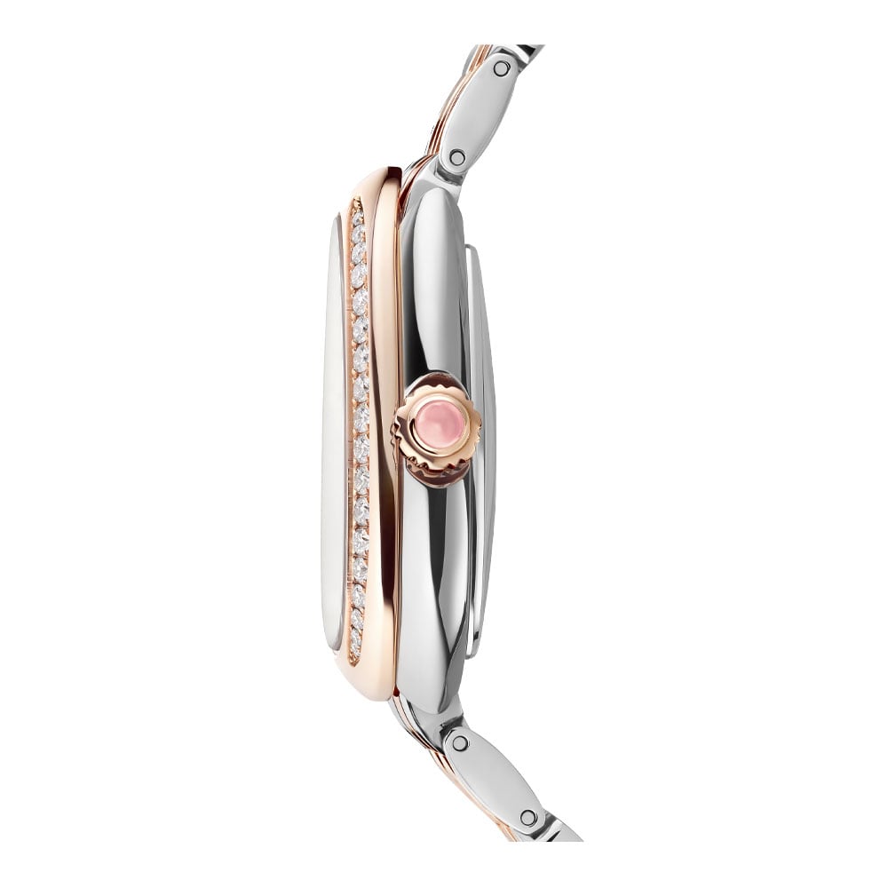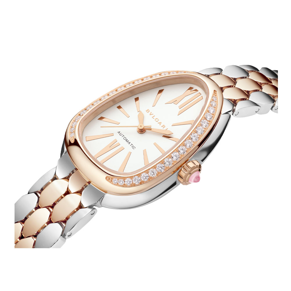 SKU: 104058Serpenti Seduttori automatic watch in 18 kt rose gold and stainless steel with diamond-set bezel and white opaline dial.