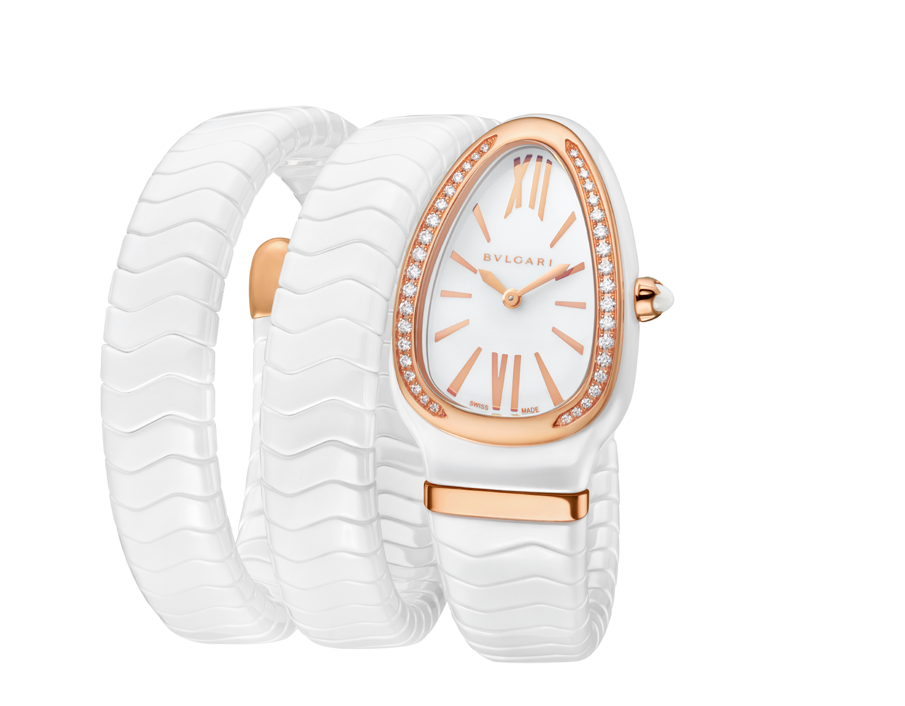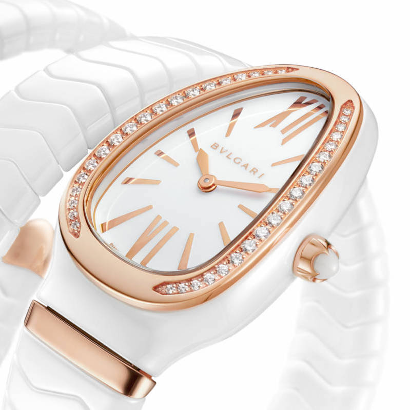 Combining the boldness of the Serpenti style with the legendary appeal of the Spiga motif, the Serpenti Spiga watch is a perfect blend of the ancient and the modern. Wrapping its sinuous geometries around the wrist, the bracelet evokes the Roman motif of the ear of wheat, a symbol of eternity and infinity. A motif with a contemporary design, enhanced by a captivating combination of materials. Serpenti Spiga watch with quartz movement, 35 mm curved case in white ceramic, 18 kt pink gold bezel set with diamonds, 18 kt pink gold crown with cabochon-cut white ceramic insert, shiny white lacquered dial, white ceramic double spiral bracelet with 18 kt pink gold elements.
