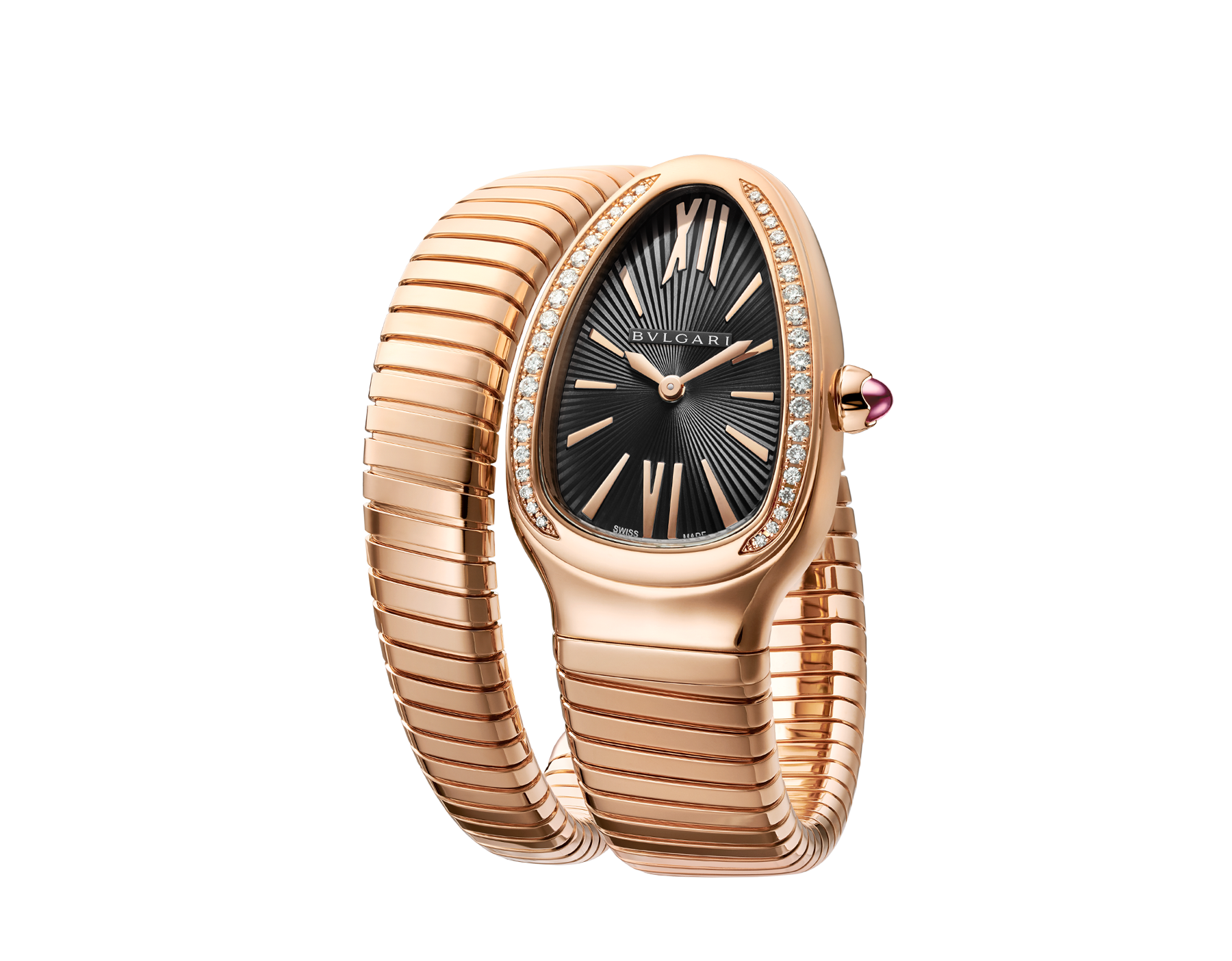 Combining two of Bulgari’s most iconic design symbols, the Serpenti Tubogas watch combines the sinuousness of the snake with the contemporary allure of Tubogas. A perfect harmony of tubular shapes that evoke the sensuality of feminine curves and the supple elegance of the snake. With its unique and captivating style, the watch renews the iconic appeal of an ever-evolving collection. Serpenti Tubogas watch with quartz movement, 35 mm curved 18 kt pink gold case set with brilliant-cut diamonds, 18 kt pink gold crown set with cabochon-cut pink rubellite, black opaline dial with guilloché soleil finish and hand-applied hour markers, 18 kt pink gold spiral bracelet.