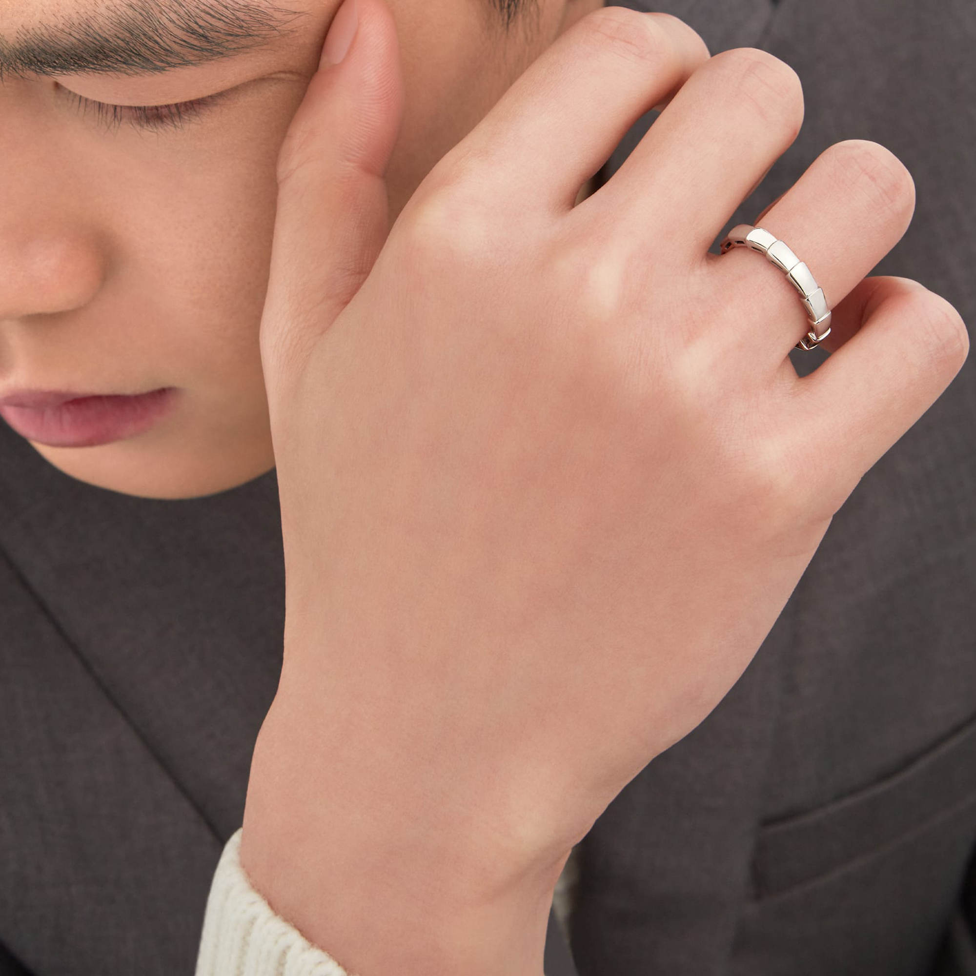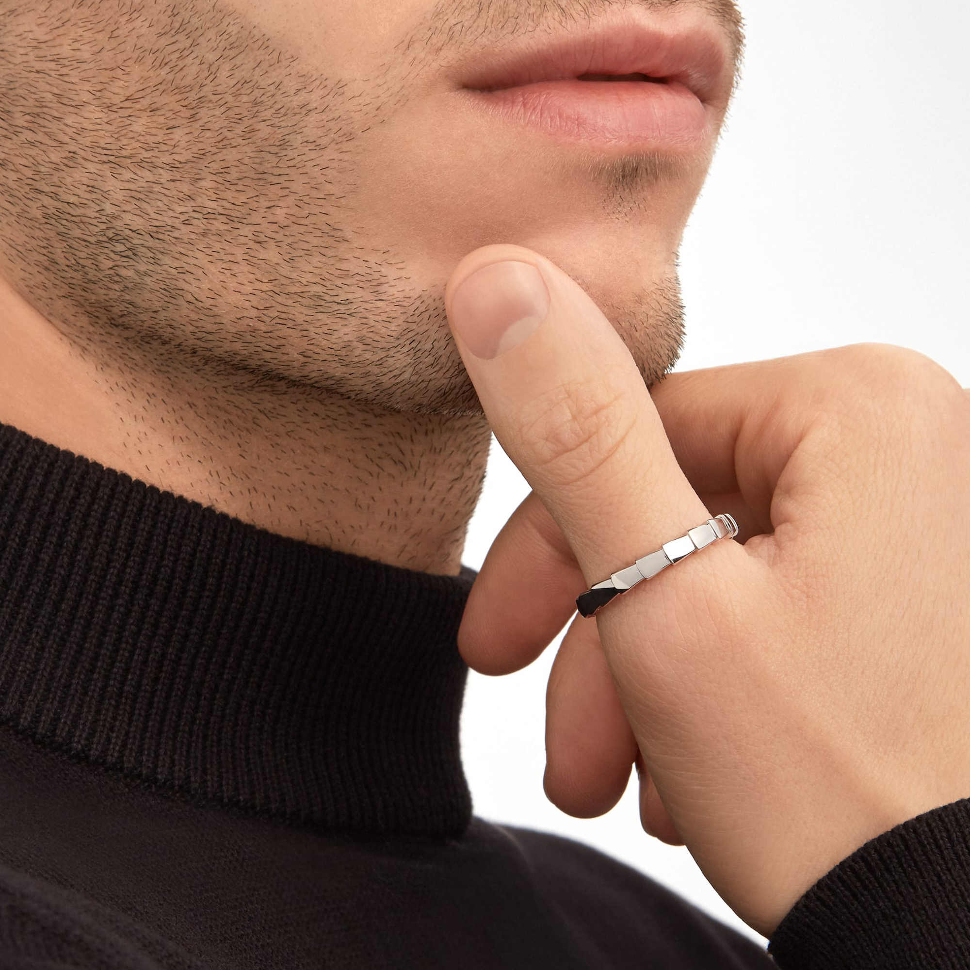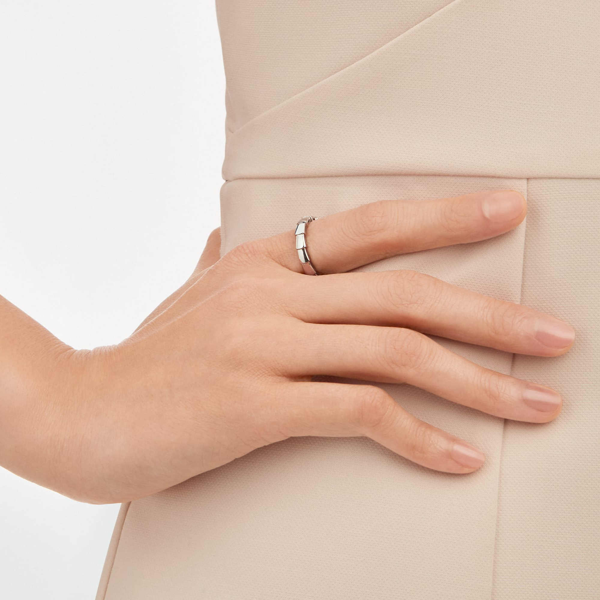 Capturing the seductive power of the serpent, Bulgari brings to life a creation of hypnotic and captivating design. A wedding band with sinuous lines that wraps around the finger with its precious coils, shining in all its sophisticated elegance. Serpenti Viper wedding band in 18 kt white gold.