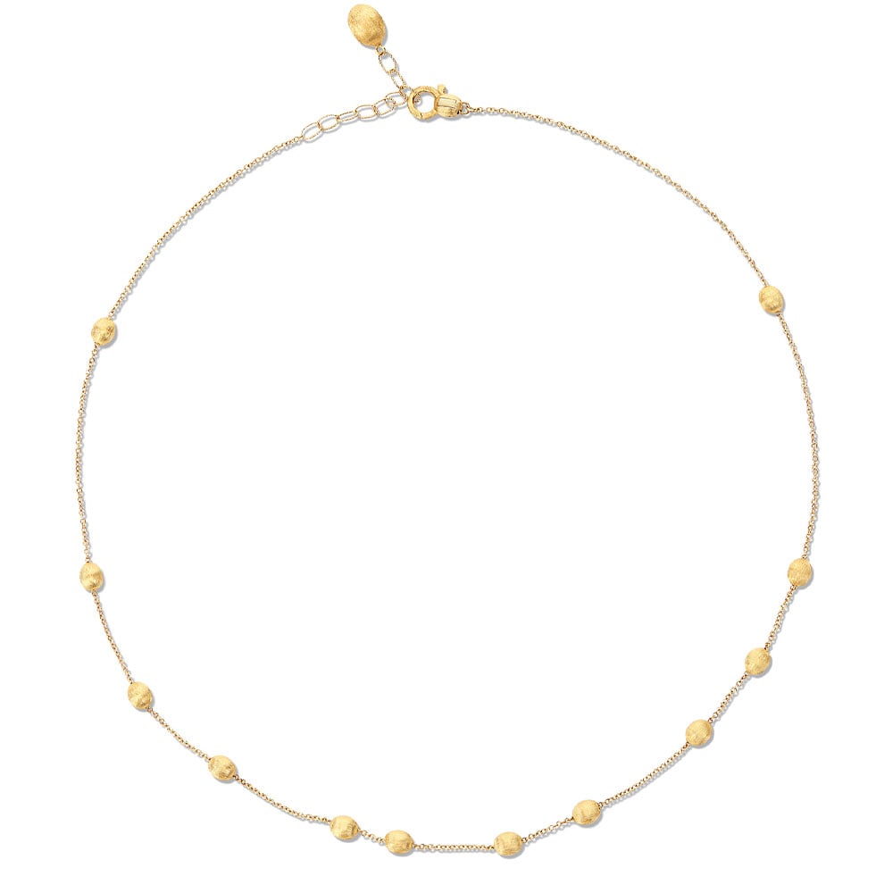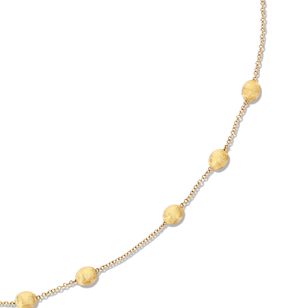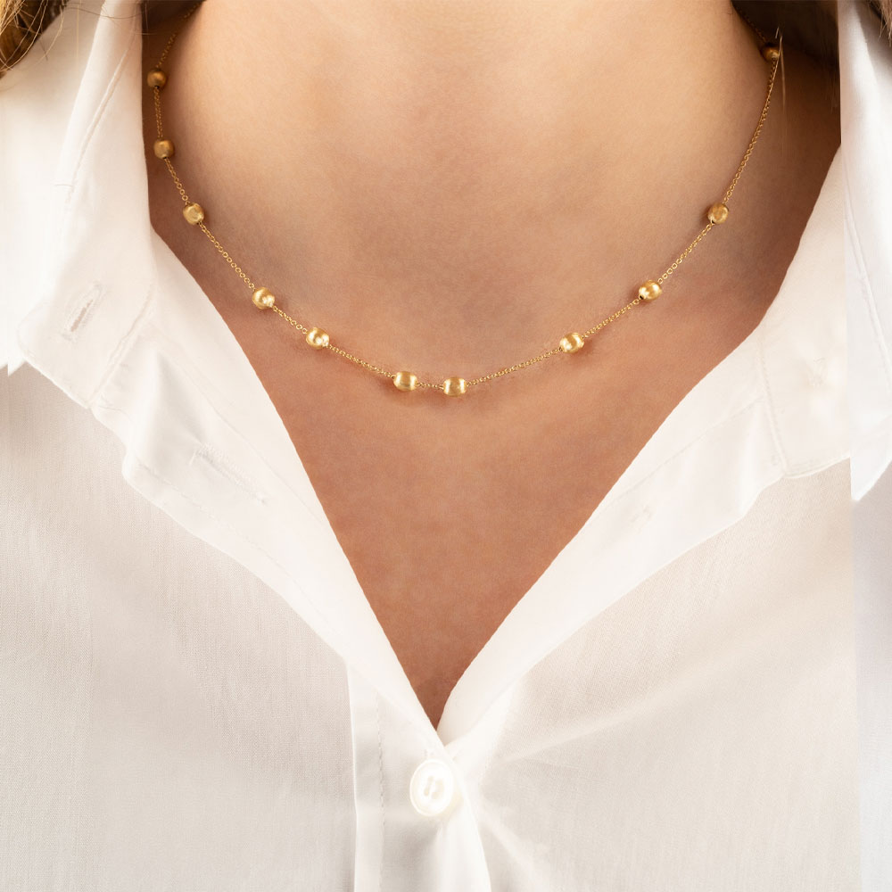 In this necklace, our precious, hand-engraved 18kt gold boules come together and give life to a splendid masterpiece of italian craftsmanship. An elegant collar, that you can wear every day or for a special occasion. Either way, this delicate jewel will surprise you and will never make you go unnoticed. Our advice? Match this necklace with its bracelet (BN1-583) to highlight even more the beauty that lies in essentiality.