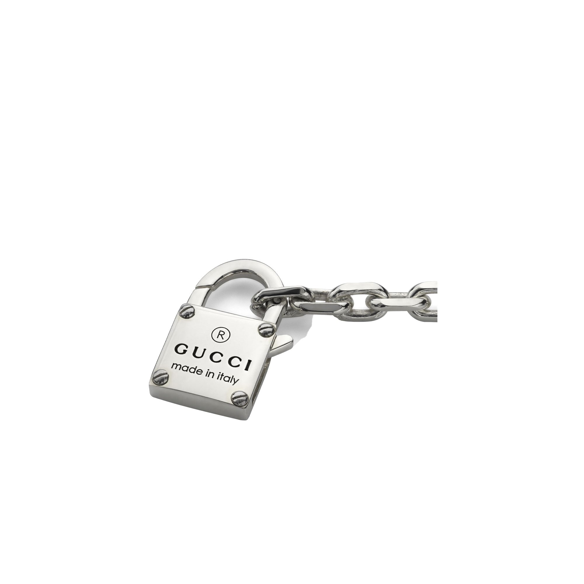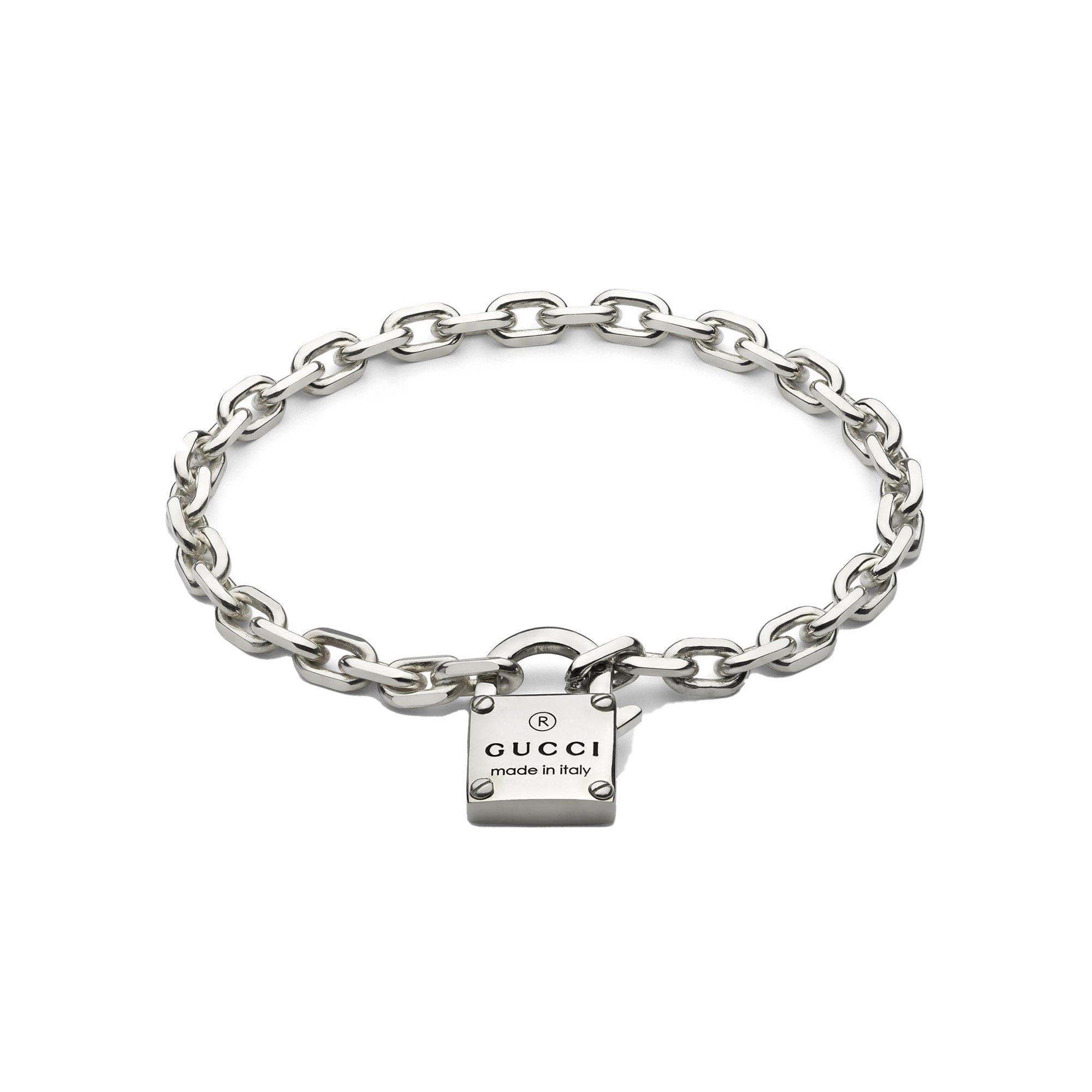 The Gucci Trademark line combines motifs and hexagonal bolt charms with the name of the House. From the cut-out heart to the padlock pendant, playful symbols continue to distinguish a selection of rings, necklaces, bracelets and earrings for Pre-Fall 2024. A Gucci Trademark engraved padlock defines this sterling silver chain bracelet.