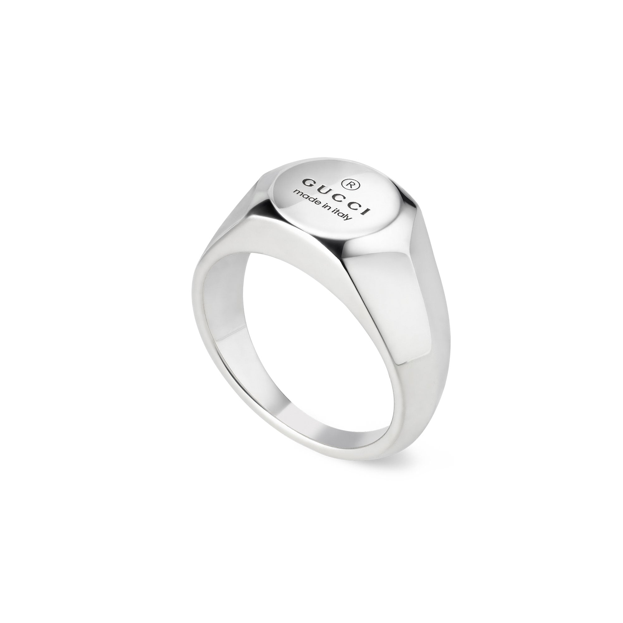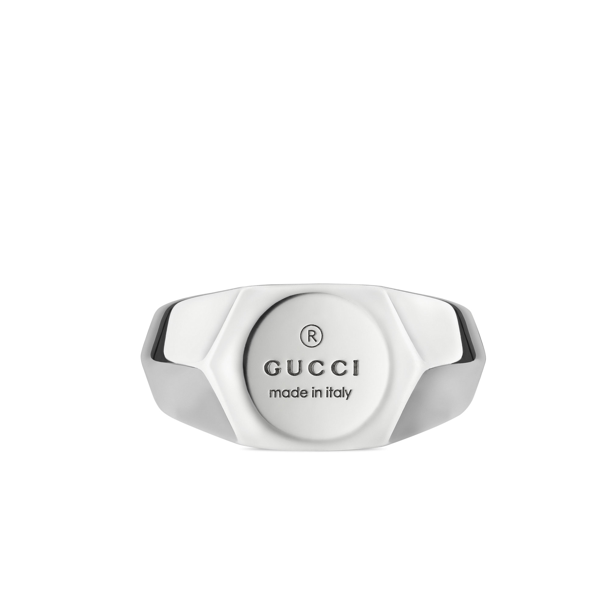 Crafted from 925 sterling silver, the Gucci trademark engraving defines this ring, a jewellery piece reflecting the House’s narrative. The faceted detail further enhances the accessory.