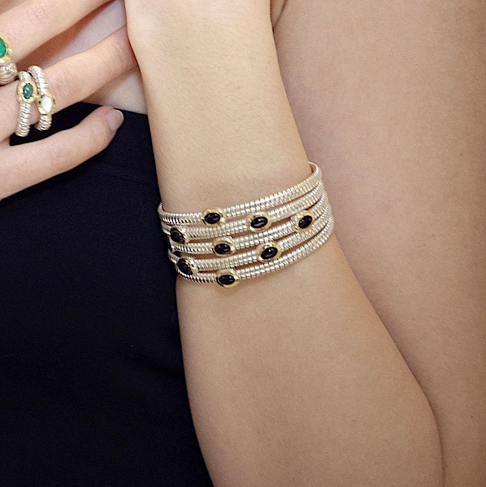Tubogas bracelet in 925 silver with gold finish and onyx is inspired by the Roman age when a twisted thread on itself gave life to a knit that today is known to the world as tubogas. The Roman patricians wore flexible bracelets that could go up to the apex of the arm as if it were wrapped in the coils of a shining reptile.