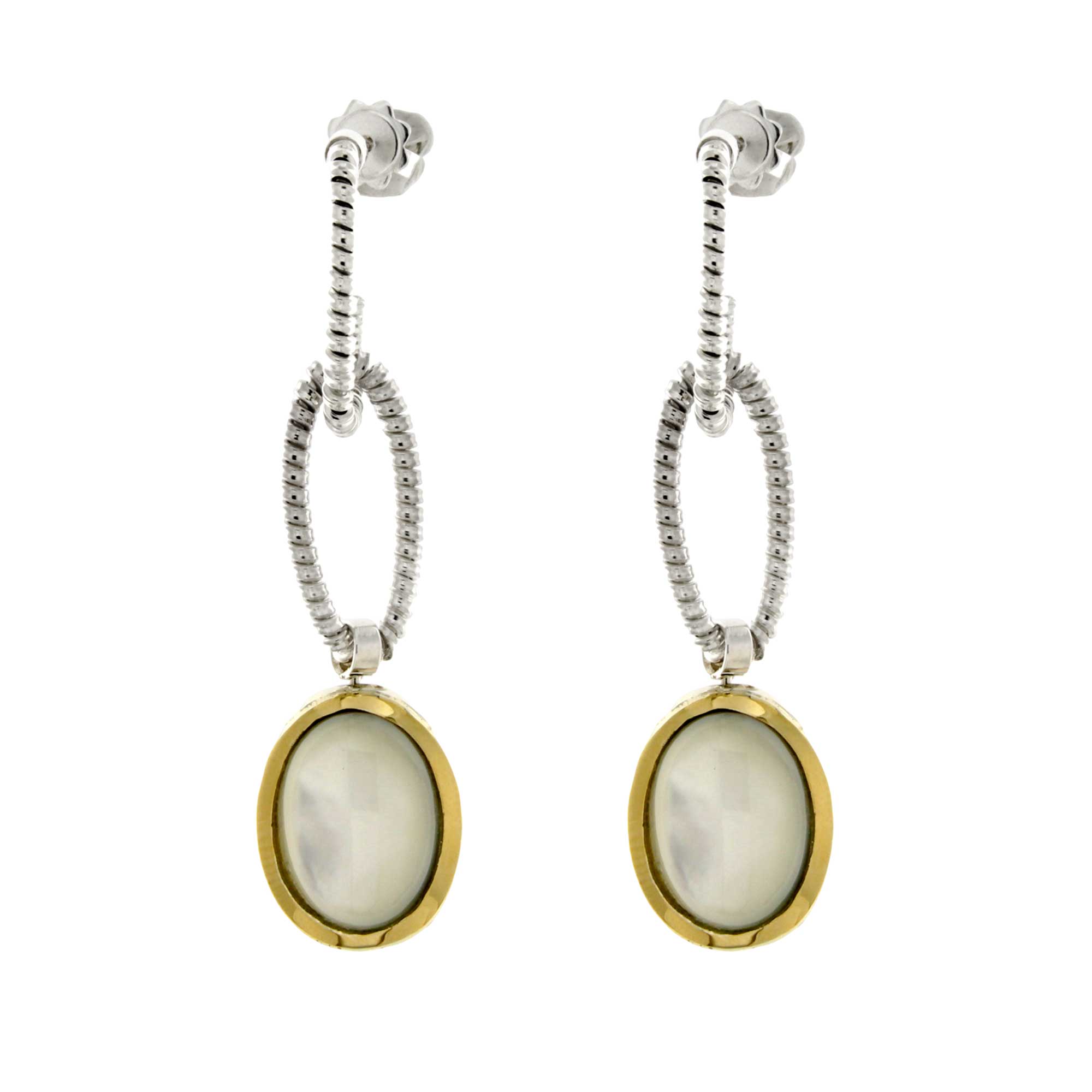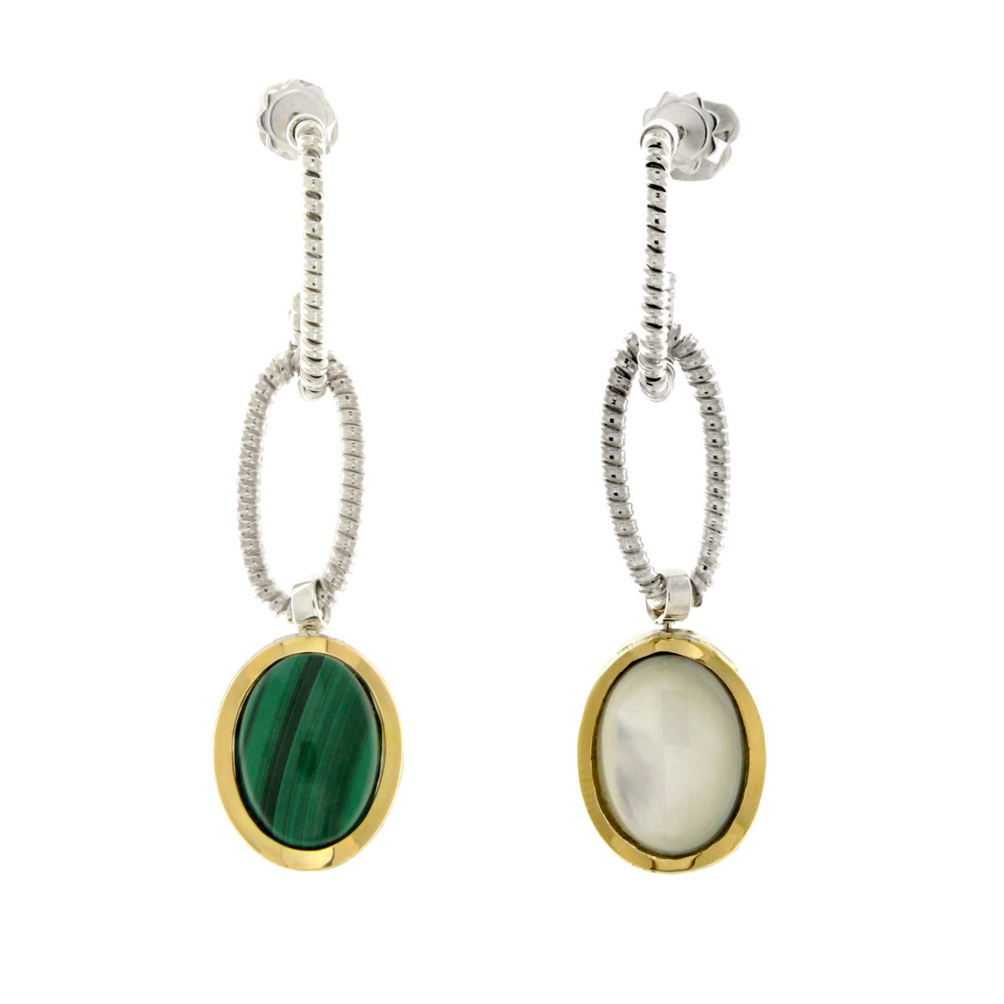Tubogas link earrings with mother of pearl and malachite double face pendants
