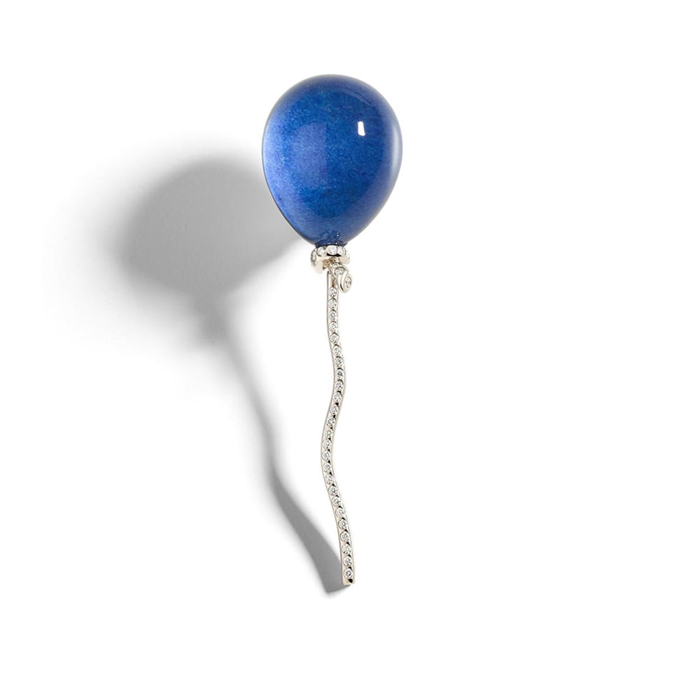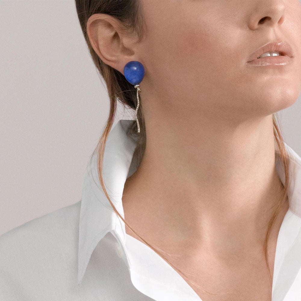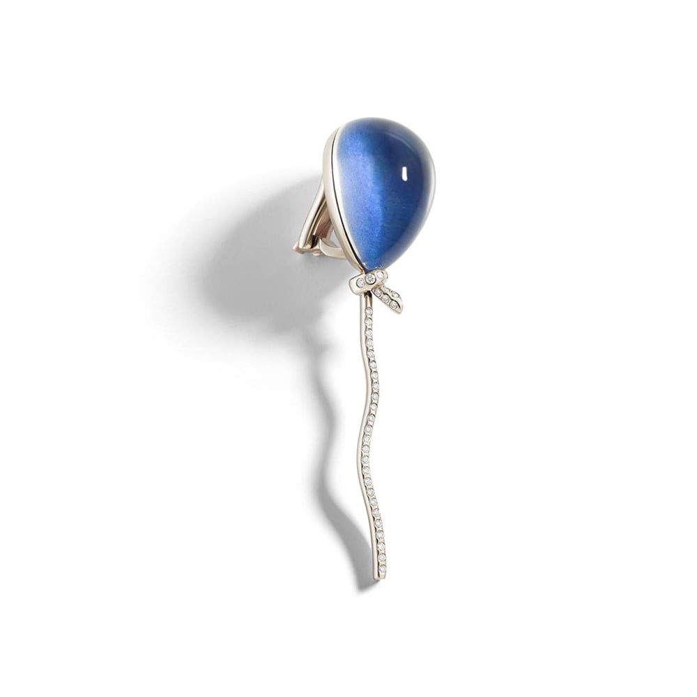 Playful, refined and unconventional, this Palloncino earring is the faithful reproduction of its namesake brooch, which was designed in 1984 and went on to become one of Vhernier’s best seller. Made in white gold, with a rope of wonderful diamonds, it pairs beautiful lapis lazuli with rock crystal to create one of Vhernier’s famous transparencies. This clip-back style can be worn alone or paired with another Palloncino earring— and mismatching colors is always encouraged!