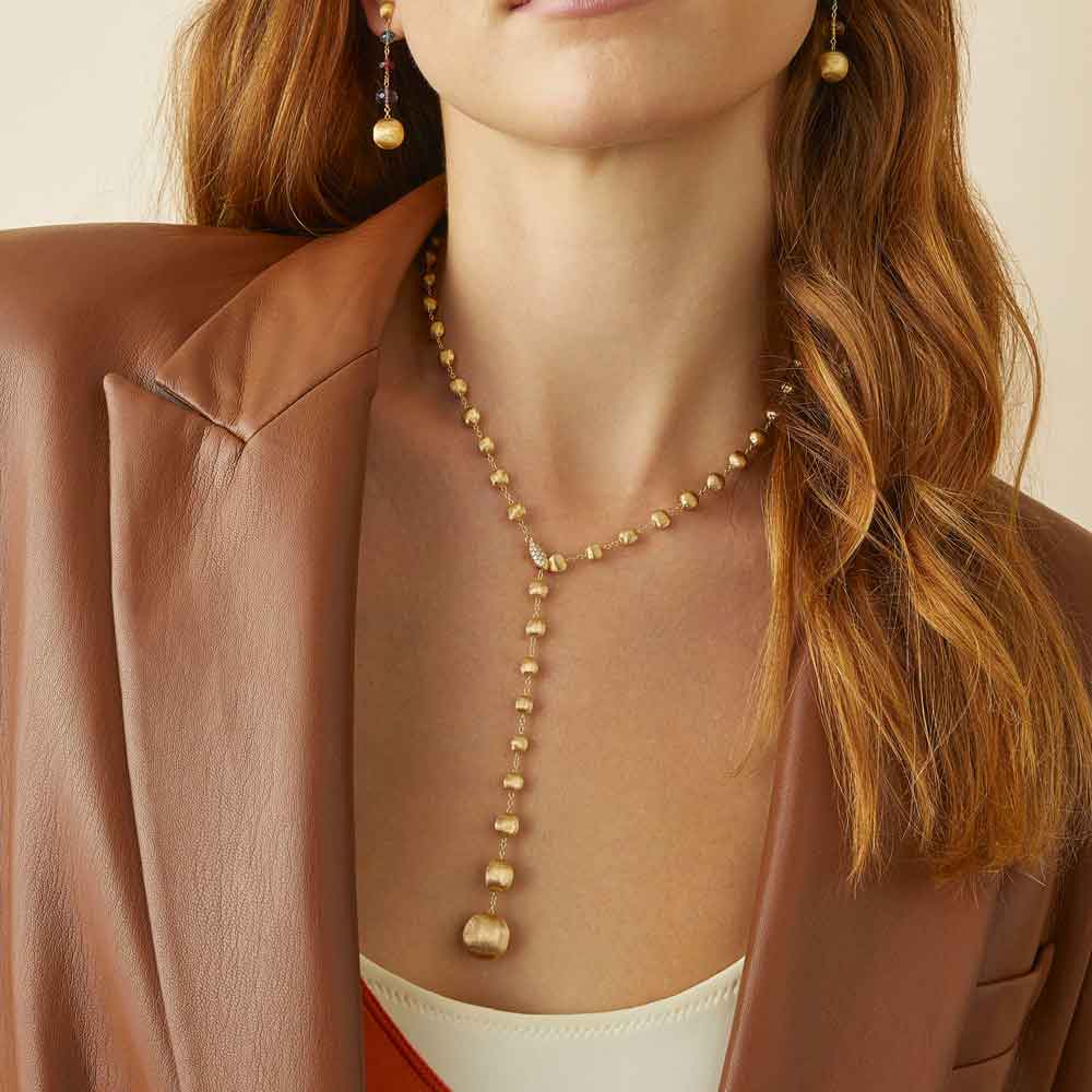 Sophisticated and precious, the 18kt yellow gold lariat necklace is finely hand-engraved with an ancient Florentine technique and features an eye-catching diamond clasp. The adjustable length provides the perfect fit and endless possibilities for any neckline, outfit, or occasion.